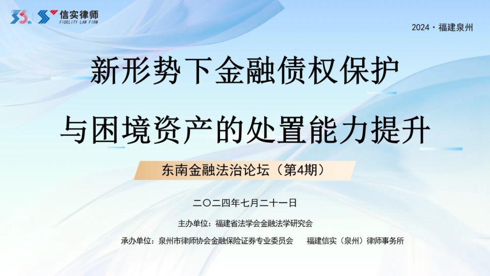 2024年7月21日上午9时至12时,以“新形势下金融债权保护与困境资产的处置能力提升”为主题的东南金融法治论坛(第4期)在福建信实(泉州)律师事务所(以下简称“信实泉州律所”)成功举办。本次论坛由福建省法学会金融法学研究会、厦门大学金融法研究中心主办,泉州市律师协会金融保险证券专业委员会、福建信实 (泉州)律师事务所承办。本次论坛邀请了法学学界学者、律师事务所律师、高校法学院教授、金融机构人士等前来参与。