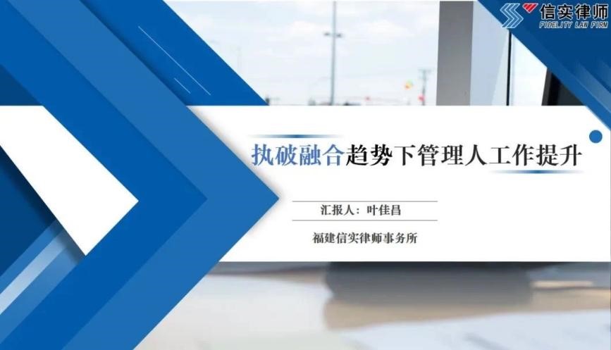 叶佳昌律师为大家分享了《“执破融合”背景下破产管理人的工作提升》。叶佳昌律师分别从执破融合的历史沿革、金融债权在执破场景下遇到的问题和自我保护、执破融合管理人工作提升几个方面全面介绍了“执破融合”背景下如何提升管理人工作,具体途径例如在强制执行阶段前置介入进行管理人工作、在破产程序中主动提升工作质效。