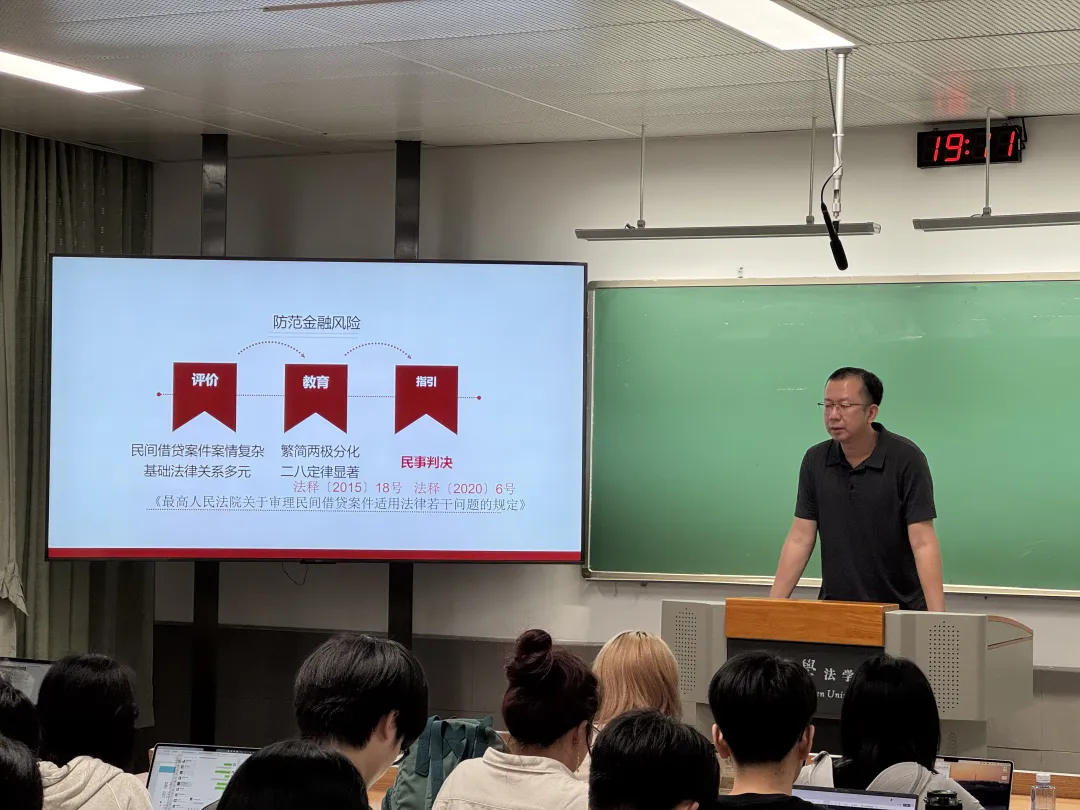 再次,林鸿法官的课堂教学方式尤为引人入胜。他通过提问和案例分析的方式引导同学们思考,促使同学们跳出传统法律框架,深入探索案件背后的社会意义。这种启发式教学激发了同学们的批判性思维和自主学习的热情。在课堂中,同学们针对“砍头息”“套路贷”“P2P网贷”等热点问题展开讨论,直面社会中的实际争议点和法律挑战,深刻体会金融司法的复杂性和现实意义,由此获取了更全面的视角以理解和分析问题。