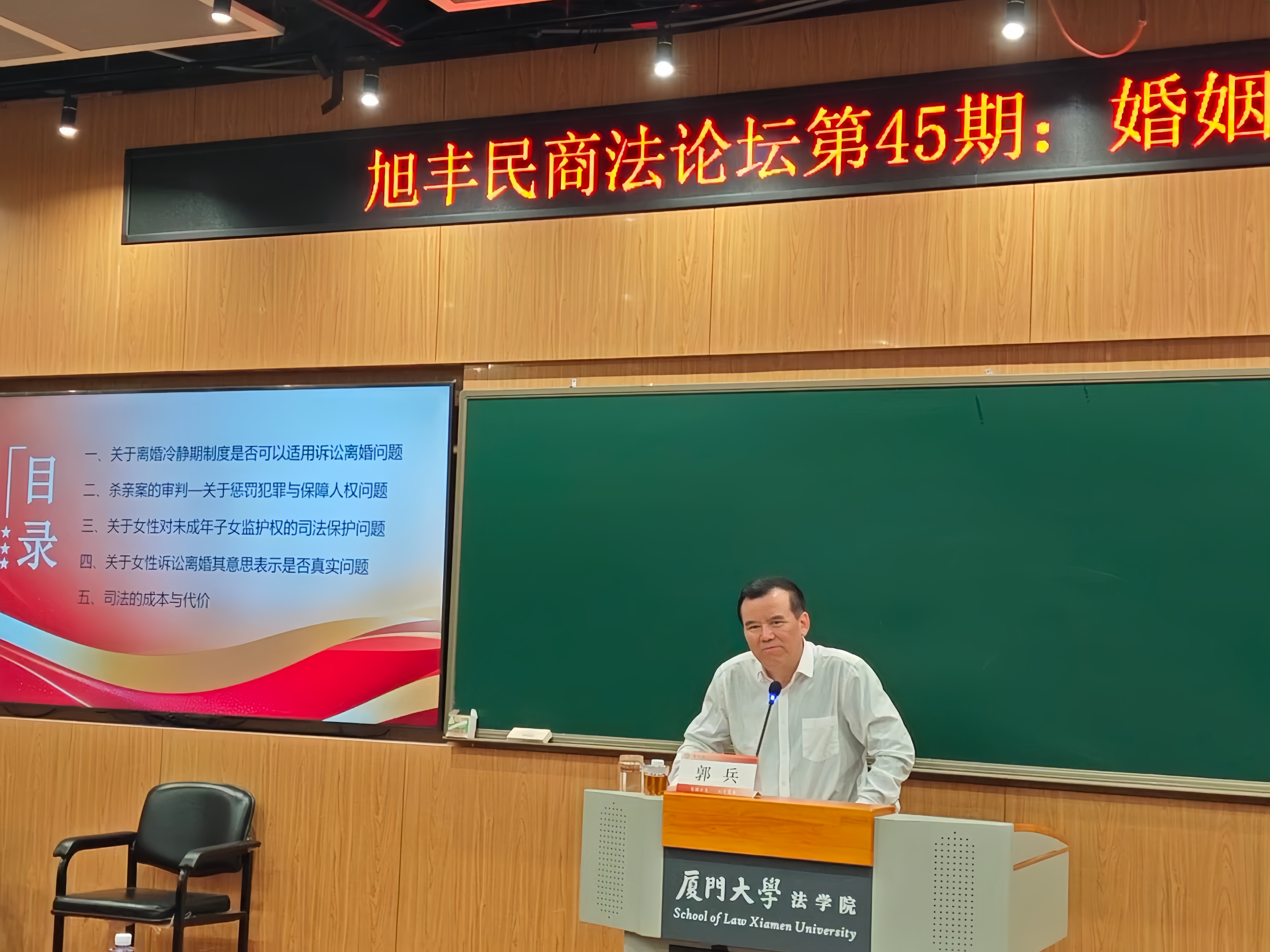 2024年12月1日晚,由厦门大学法学院与福建旭丰律师事务所联合主办的第四十五期“旭丰民商法论坛”在法学院B138会议室顺利举办。此次论坛聚焦婚姻家庭法,围绕“彩礼给付”“女性权益司法保护”进行专题探讨。论坛由厦门大学法学院何丽新教授主持,校内师生及多名校外律师参与。