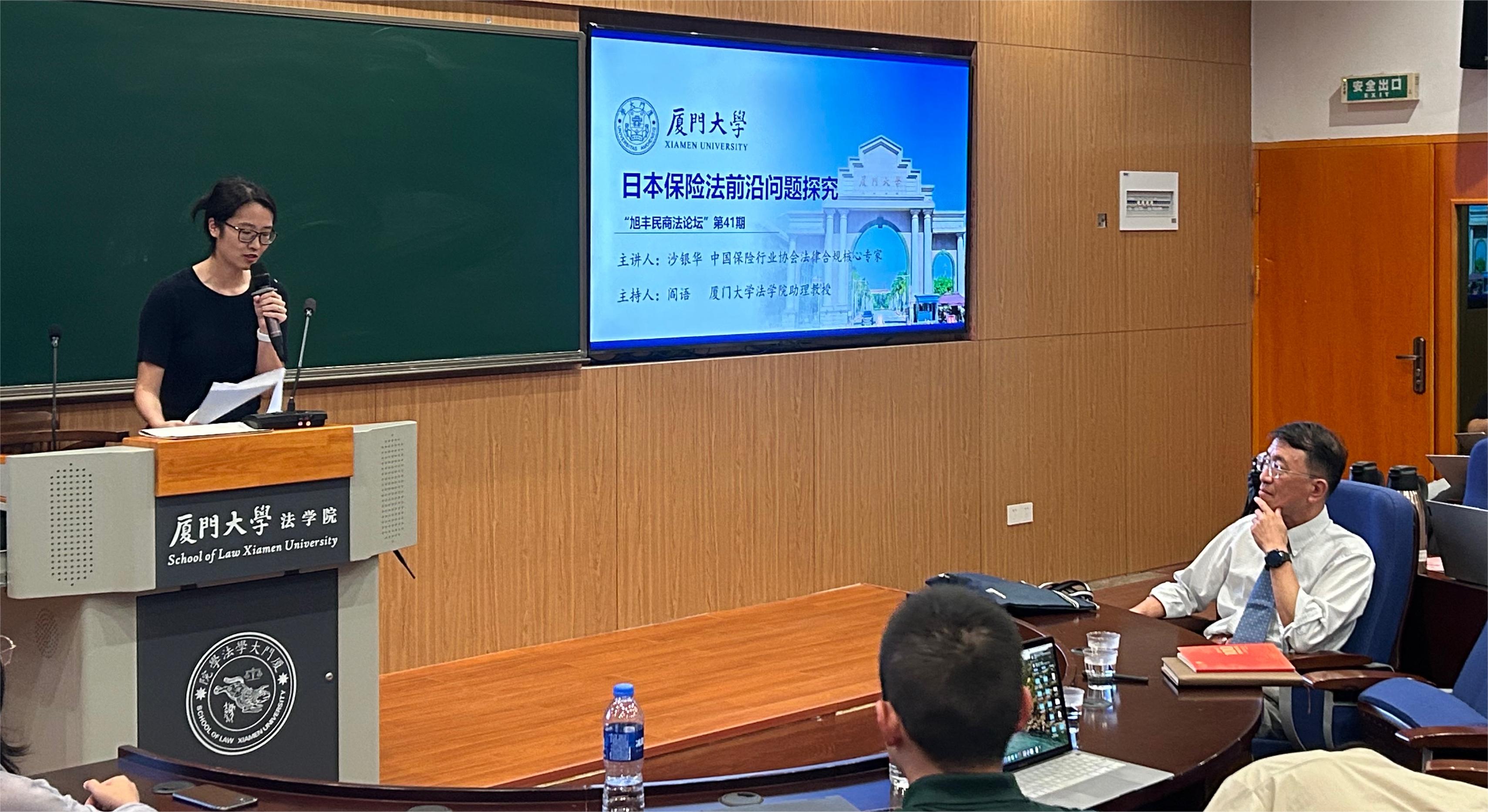 2023年9月19日19点,由厦门大学法学院与福建旭丰律师事务所联合主办的第四十一期“旭丰民商法论坛”在法学院B138会议室顺利举办。中国保险行业协会法律合规核心专家团专家、华东师范大学保险硕士专业学位研究生行业产业导师沙银华进行了题为“日本保险法前沿问题研究”的专题讲座。此次讲座由厦门大学法学院阎语助理教授主持。法学院师生、校外律师等近百人参加了本次讲座,现场座无虚席。