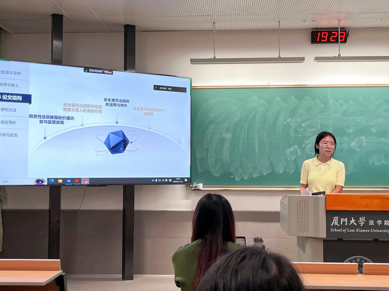 第二位发言的同学是岳佳雪同学,她赏析了成都理工大学文法学院郭锋教授的《前景性信息披露与安全港制度》。岳佳雪同学认为文章紧紧围绕《证券法》第84条和《虚假陈述司法解释》第6条,论证前景性信息披露的价值功能、监管政策以及安全港制度的相关内容。在研究方法上,文章采用了数据分析法、规范分析法等法学研究方法,深入浅出地论述了安全港制度的激励作用、构成要素、适用情形与例外,以及对安全港制度关涉的重大性问题做出了回应。肖老师认为这篇文章在内容的条分缕析与体系的逻辑建构上展现出清晰度和系统性,其体系化的论证方式为我们提供了学习范例,同时指出大家在写论文时要考虑目标刊物和读者。
