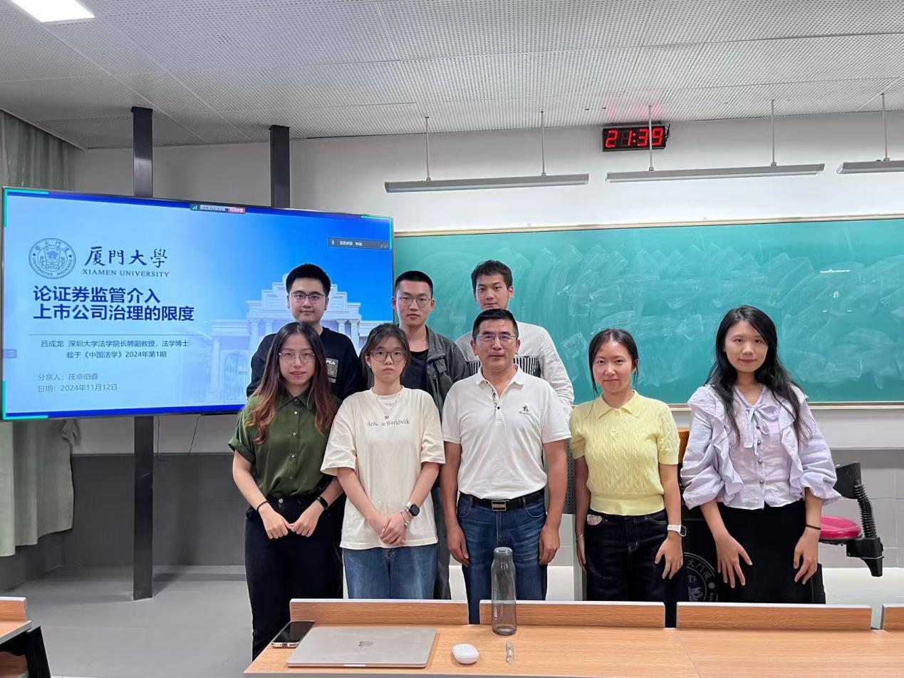 第四位分享人是庄卓伯鑫同学,他赏析的是深圳大学法学院吕成龙副教授的《论证券监管介入上市公司治理的限度》一文。庄卓伯鑫同学从论文选题、内容结构、亮点阐述及启示思考四个方面对这篇论文进行赏析,认为论文的选题展现出鲜明的问题导向,极具现实意义和理论价值。论文运用了包括逻辑推理、比较分析、案例研究等在内的多样化的方法,这些方法的灵活运用使得论文的论证过程更为严谨,增强了论文结论的说服力,为大家今后在提升论文写作能力方面提供了一定的学习价值。肖老师指出,文章提出的信息对称标准具有一定的前瞻性和创新性,也为有志从事相关方面研究的同学提供了寻找证券监管和公司治理之间平衡点的参考,但也要注意在研究维度上表述不能太过绝对。肖老师建议大家在研究时要更加全面地进行规范分析,确保研究的深度和实用性。