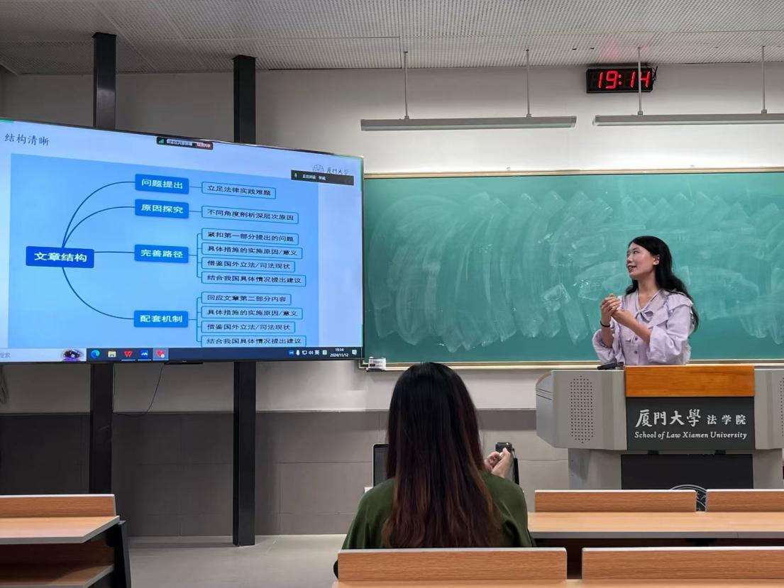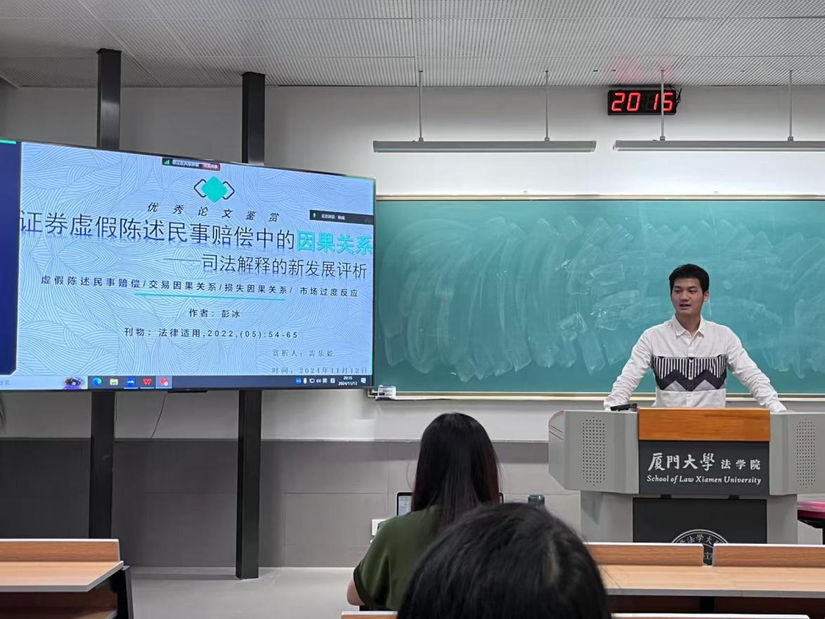 首先发言的是肖艺巍同学,她鉴赏的论文是中央财经大学法学院邢会强教授的《证券虚假陈述赔偿的巨额化与有限社会化分散机制》。肖艺巍同学首先分析了文章选题背景、选题优势,紧接着介绍了文章的主要内容。我国证券虚假陈述赔偿的巨额化与威慑过度及赔偿不足的双重困境出现的主要原因是侵权法律制度的扩张,有限的社会化分散机制及相关配套措施有助于解决这一现实困境。肖老师认为这篇文章内容详实丰富,体现出理论与实务相结合的研究取向,研究方法运用娴熟。结合这篇论文,肖老师鼓励大家关注司法实践的最新动态与发展趋势,捕捉富有探讨价值的问题点,积极探索并构思出切实可行的解决方案。