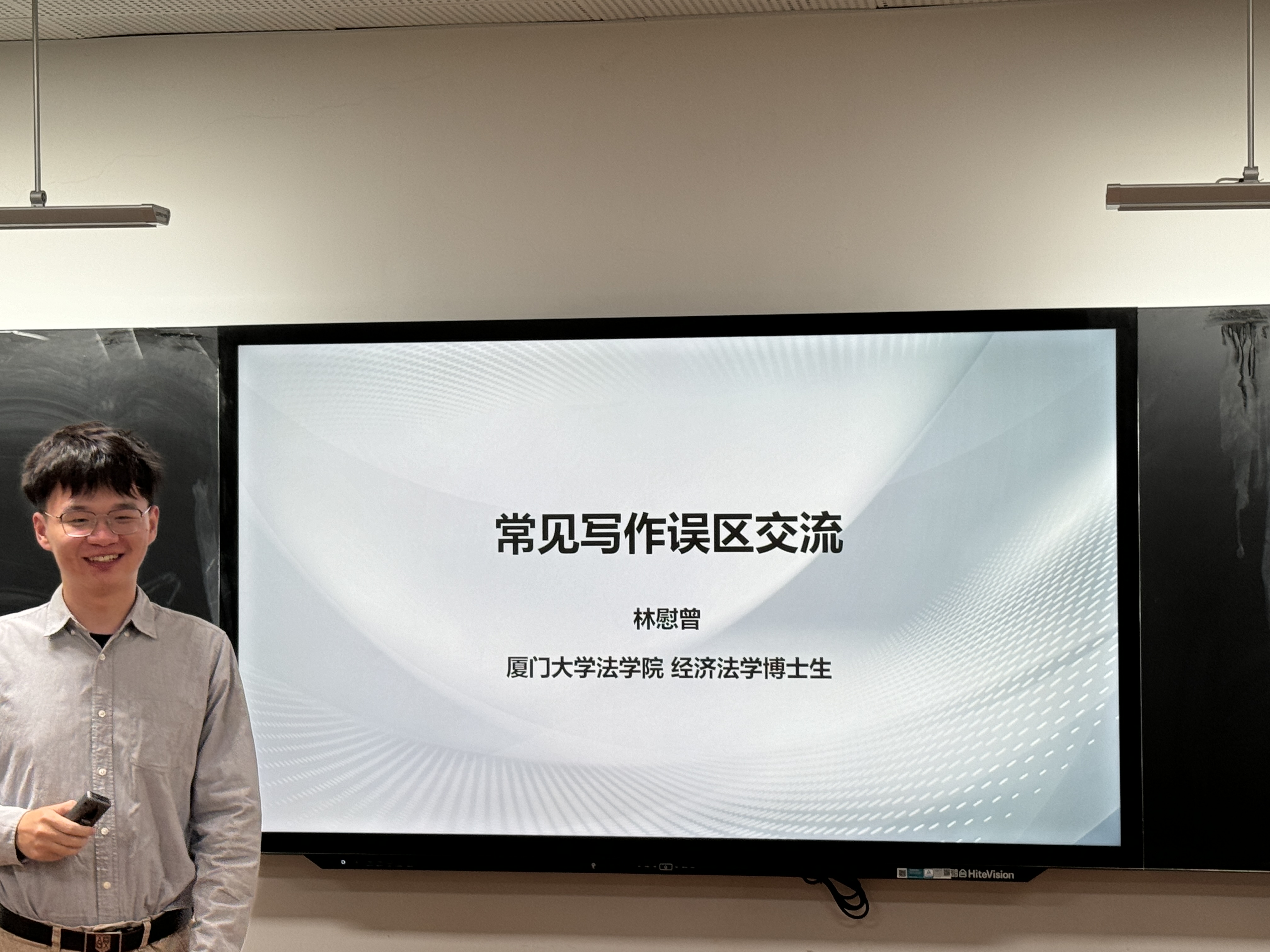 2024年4月11日晚,厦门大学金融法研究中心在法学院B521教室举行常见写作误区交流会。本次交流会由法学院2020级经济法学博士研究生林慰曾主讲,本硕博同学近二十人参加。