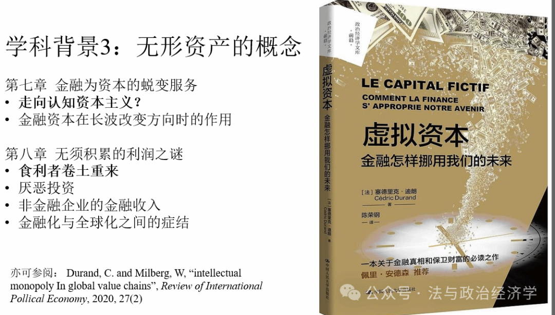 在对无形资产的食利者部分讲解时,陈荣钢老师深入剖析了其概念及具体表现形式。从概念层面来看,无形资产的形成与信息处理技术能力的质变密切相关,这种质变改变了生产和消费的地理空间,使利润更多来源于微笑曲线的两端,即知识垄断和高度竞争领域。从其具体表现形式来看,无形资产涵盖了多种租金种类,主要有知识产权租金、自然垄断租金、无形资产的级差地租和动态创新租金四种。这些租金形式都是基于无形资产的控制,包括专利、商标、版权、技术标准、数据等。陈荣钢老师特别指出,资本收益的最大化不再依赖生产最大化,而是基于对战略要素的控制,即收益并不直接来源于生产活动,而是通过控制乃至垄断某些关键资源或技术来实现。而正是基于这种控制,迪朗提出了技术封建主义的假说。