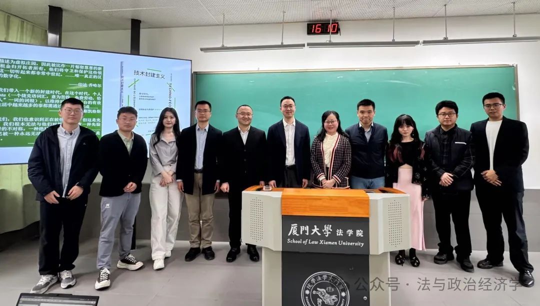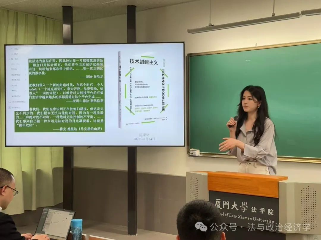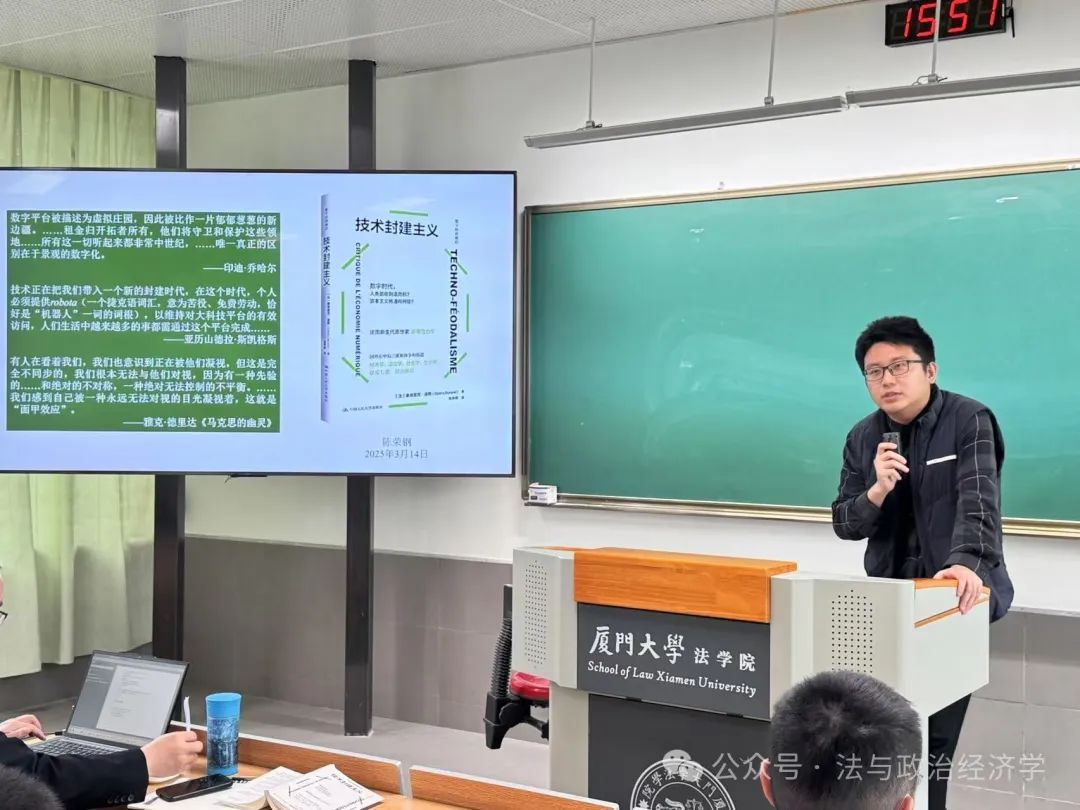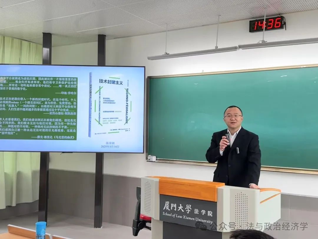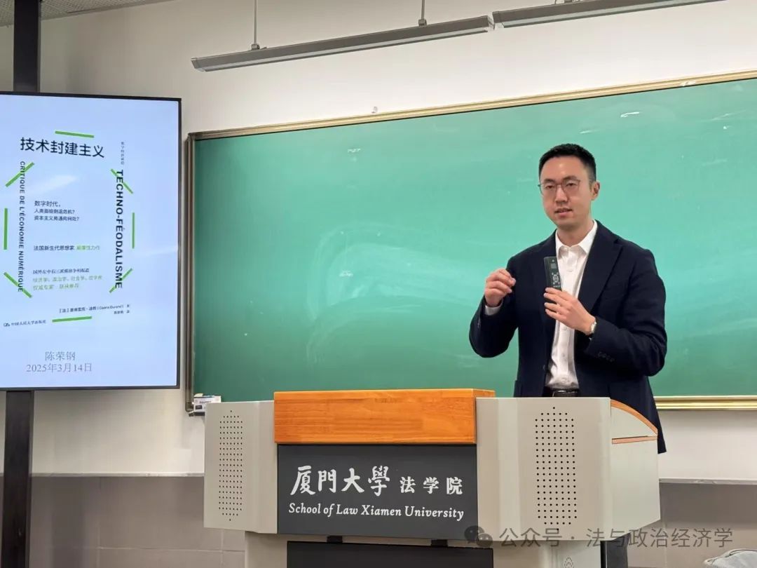 2025年3月14日下午,厦门大学法学院法与政治经济学研究中心、网络空间国际法研究中心和法律认知、数据与智能研究中心(实验室)联合主办的“数字法沙龙”第一期在法学院A201教室成功举办。本期沙龙以“技术封建主义:数字统治与资本食利”为主题,特别邀请到伦敦政治经济学院博士、厦门大学电影学院陈荣钢老师担任主讲嘉宾,厦门大学法学院法与政治经济学研究中心主任毛海栋老师担任主持人。来自厦门大学医学院、台湾研究院、国际关系学院/南洋研究院、生命科学学院、马克思主义学院和法学院的马永慧、刘文戈、苏世天、吕建伟、许弘智、吴旭阳、王云清、许瑞超、沈晓白、傅雪婷等老师作为与谈人参与了本次活动,法学院本硕博学生到场聆听。
