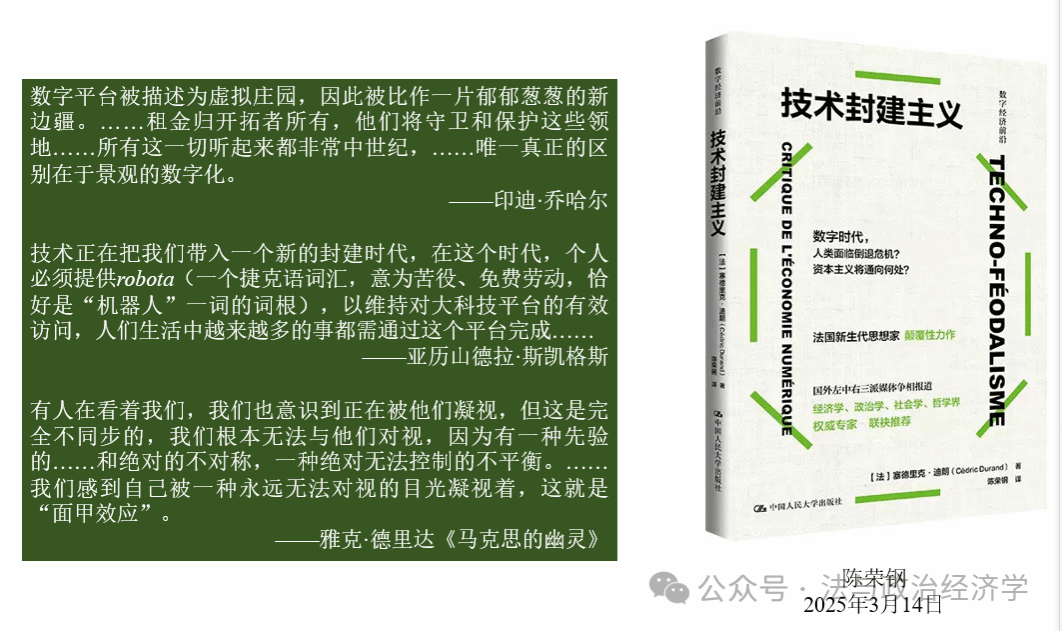 陈荣钢老师的讲座紧紧围绕其译著《技术封建主义》的四个章节——加州意识形态、数字统治、无形资产的食利者和技术封建主义假说展开。陈老师结合自身在政治经济学、媒介研究等领域的学科背景,对数字时代资本主义的结构性矛盾进行了系统分析。