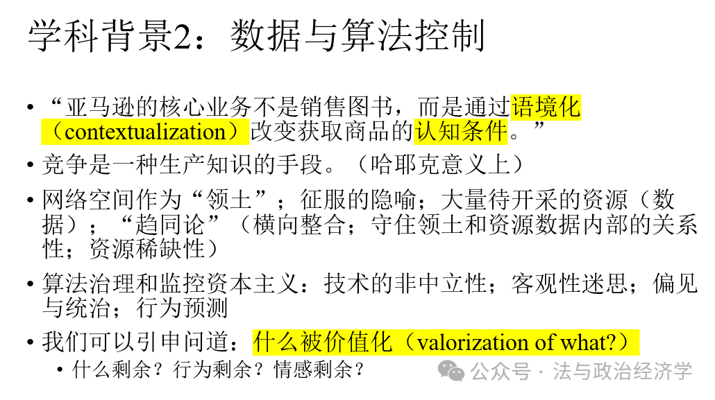 接下来,陈荣钢老师详细阐释了数字统治的内涵。首先,数字统治体现为数据与算法的控制。以亚马逊为例,其核心业务是借助语境化改变商品认知条件,而非销售图书。同时,数据和算法还重塑了人们对知识的理解。在技术封建主义的思想中,网络空间被喻为领土,而数据就如同民主政府所需要的待开采资源一样。陈老师指出,在对平台化趋势的研究中可以发现,许多“大而不倒”的科技企业不断横向整合,利用源头性横向数据来追逐数据的稀缺性,以至于各企业板块产生趋同现象。再者,算法治理与监控资本主义是数字统治的关键特征。由于技术具有非中立和非客观的特征,算法治理往往存在歧视或偏见,而这一迷思也引起了国内外诸多学者的研究兴趣。陈老师以梅尔·勋伯格和库克耶等外国学者的观点为例,向大家介绍了关于数据监控、算法化的社会关系、数据挖掘以及将货币化作为技术工具等方面的理论,以更好地理解数字统治的内涵。
