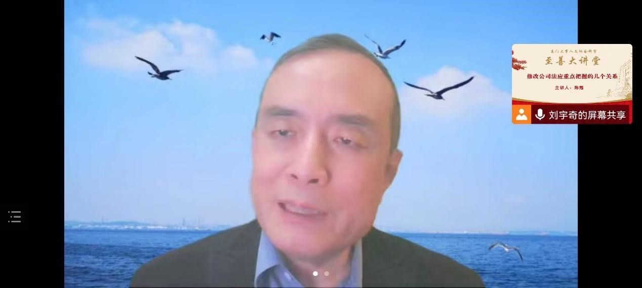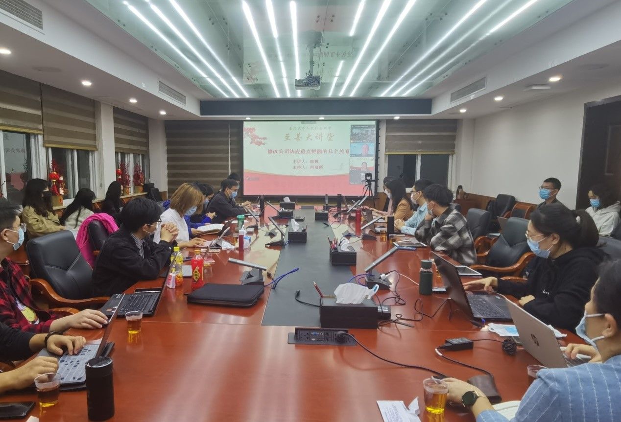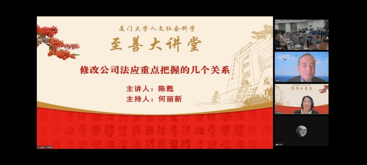 2022年11月25日19时,由厦门大学社科处主办,法学院承办的厦门大学人文社科“至善大讲堂”第61讲如期举行。中国社会科学院学部委员、法学研究所研究员、《法学研究》主编陈甦进行了题为“修改公司法应重点把握的几个关系”的专题讲座。本次讲座由厦门大学法学院何丽新教授主持,法学院王兰副教授、吴旭莉副教授、阎语博士,以及校内外师生、法官、律师等共百余人以线上线下相结合形式参加了本次讲座。讲座伊始,何丽新教授对陈甦研究员发表欢迎致辞,并简要介绍了公司法修改的历程,表明此次公司法修改意义重大。