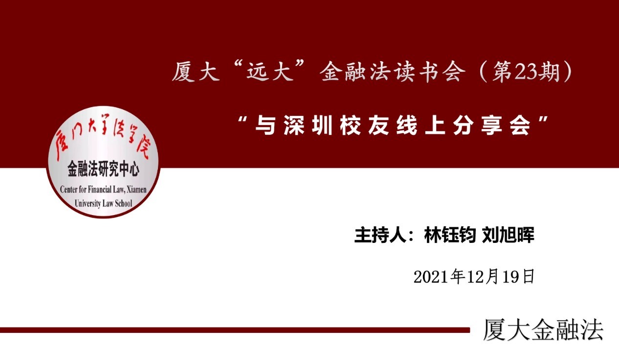 2021年12月19日晚,厦大“远大”金融法读书会(总第23期)之“与深圳校友线上分享会”在线上准时举行。本次分享会由2020届毕业生林钰钧和2020级国际法硕士研究生刘旭晖担任主持人,金融法中心师生近50人线上参与。分享嘉宾有2017届毕业生王素芬、2020届毕业生念伯涛、罗捷和林钰钧以及2021届毕业生郭江。金融法中心主任刘志云教授全程参加了分享会,并对系列分享会做了总结。