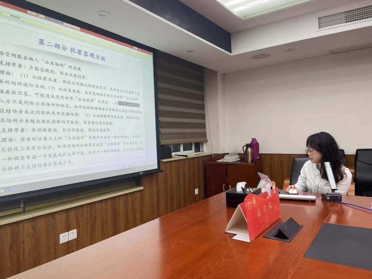 杨婷同学汇报完毕后,由23级法律硕士蔡婕妤同学汇报有关于网络寻衅滋事的文献综述。汇报从典型案件、犯罪构成要素以及与他罪的关系等多方面归纳梳理了网络型寻衅滋事的学界争议。通过类案研究对司法适用中存在的问题及成因进行分析,并提出相关建议。