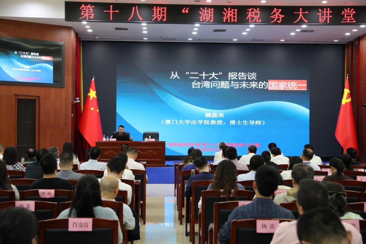9月22日,湖南省税务局第十八期“湖湘税务大讲堂”开讲。我院魏磊杰教授应邀飞赴长沙以《从“二十大”报告谈台湾问题与未来的国家统一》为题作专题报告。国家税务总局湖南省税务局党委书记、局长曾光辉全程参加并对讲座给予高度评价。湖南省税务局党委委员、副局长曾初良主持讲座。