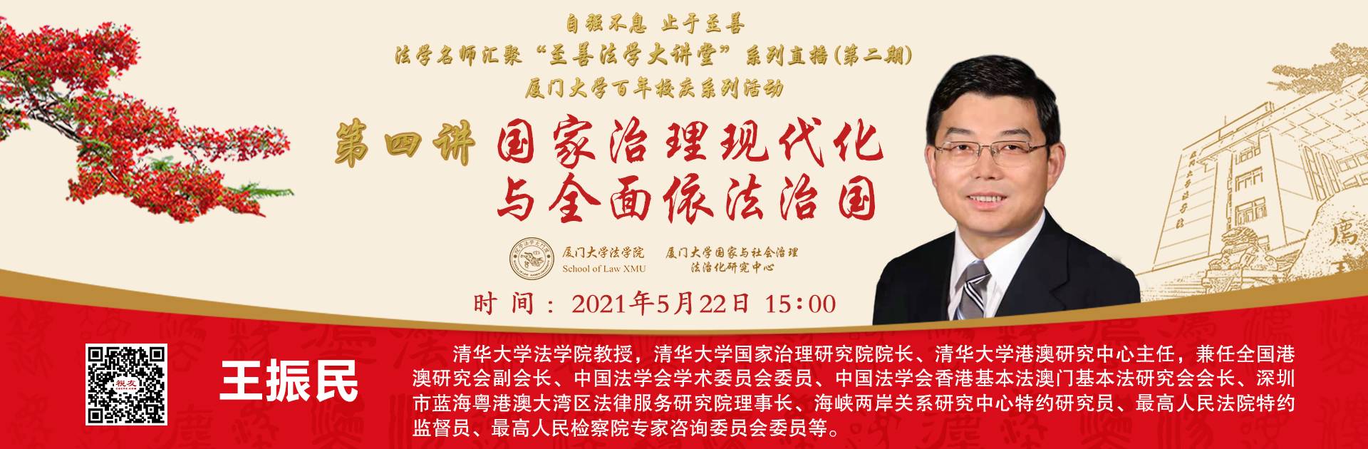 至善法学大讲堂是厦门大学法学院面向广大师生、校友、法律工作者举办的大型学术活动,旨在促进院校学术交流,活跃学术氛围,推动法学学科的建设与发展。正值中国共产党建党100周年与厦门大学建校100周年之际,至善法学大讲堂第二期将于2021年5月至9月举办,大讲堂将继续邀请知名法学家及实务专家作学术讲座。“名家汇聚,止于至善”,精彩呈现。