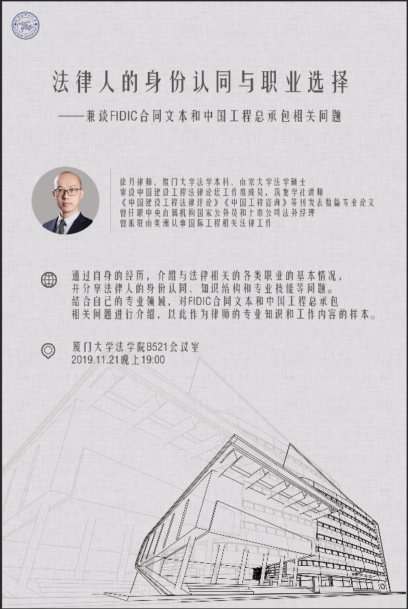 徐丹校友将通过自身的经历,介绍与法律相关的各类职业的基本情况,并分享法律人的身份认同、知识结构和专业技能等问题。还将结合自己的专业领域,对FIDIC合同文本和中国工程总承包相关问题进行介绍,以此作为律师的专业知识和工作内容的样本。