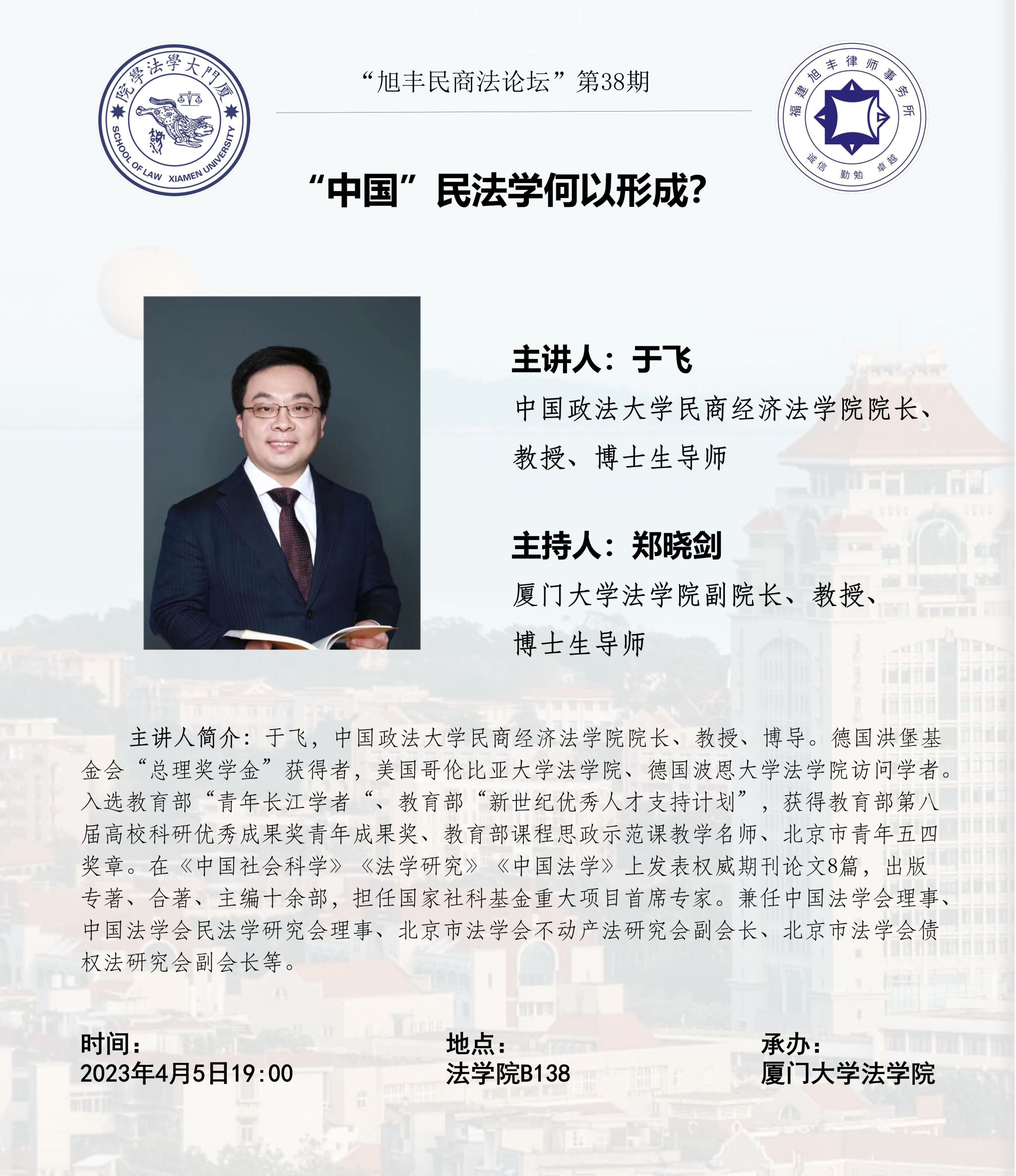 主讲人简介:于飞,中国政法大学民商经济法学院院长、教授、博导。德国洪堡基金会“总理奖学金”获得者,美国哥伦比亚大学法学院、德国波恩大学法学院访问学者。入选教育部“新世纪优秀人才支持计划”,获得教育部第八届高校科研优秀成果奖青年成果奖、教育部课程思政示范课教学名师、北京市青年五四奖章。在《中国社会科学》《法学研究》《中国法学》上发表权威期刊论文8篇,出版专著、合著、主编十余部,担任国家社科基金重大项目首席专家。兼任中国法学会理事、中国法学会民法学研究会理事、北京市法学会不动产法研究会副会长、北京市法学会债权法研究会副会长等。
