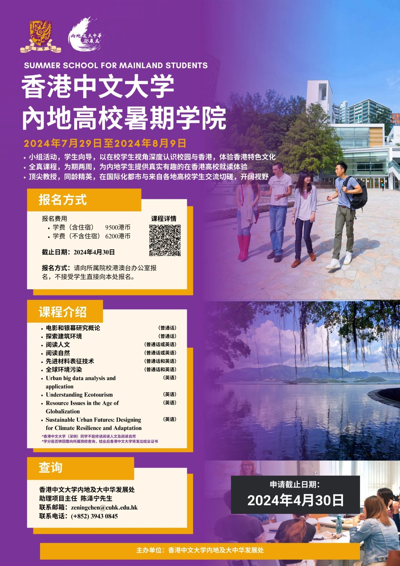 ● 费用:每人港币9,500元(含校内住宿)或港币6,200元(不含住宿)