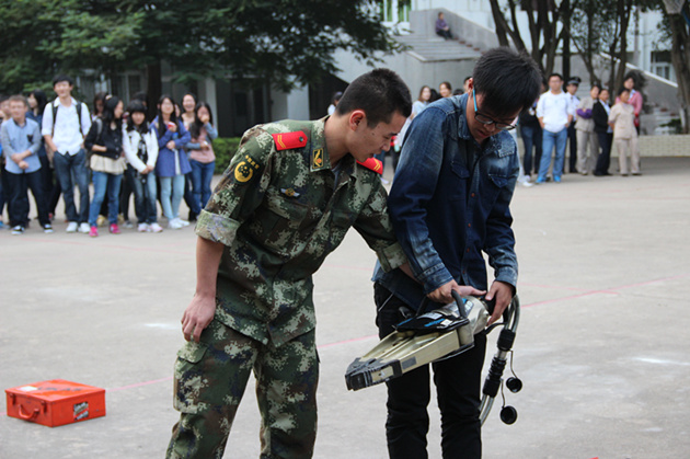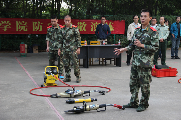 防灾演练进行到第二部分,消防中队的部分消防员先后为大家进行扩张器、顶杆、金属切割机等消防装备的展示,同学们听得十分认真,许多人还亲自上前动手感受。接着消防队员又进行了消防水袋连接的演示。