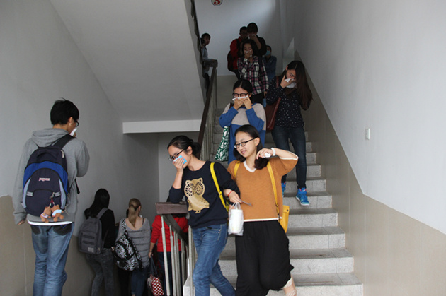 16时30分,警报声准时响起,同学们在班长及团支书的指挥下依照指定路线有序撤离教学楼,大家纷纷用口罩、湿巾保护好口鼻,快速而有条不紊地跑下教学楼、穿越烟雾弹。短时间内,全体人员都疏散完毕,在海滨篮球场集合。