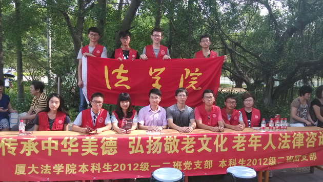 2014年9月29日,在即将迎来伟大祖国65周岁生日的时刻,厦门大学离退休工作部(处)、离退休教职工联合会主办了厦门大学离退休教职工“迎国庆,庆重阳”游园活动,其中我院本科生2012党支部、本科生2012级二班团支部组织了涉老法律咨询的志愿活动,以贯彻执行新修订的《老年人权益保障法》,有效维护老年人的合法权益,增强老年人的维权意识。
