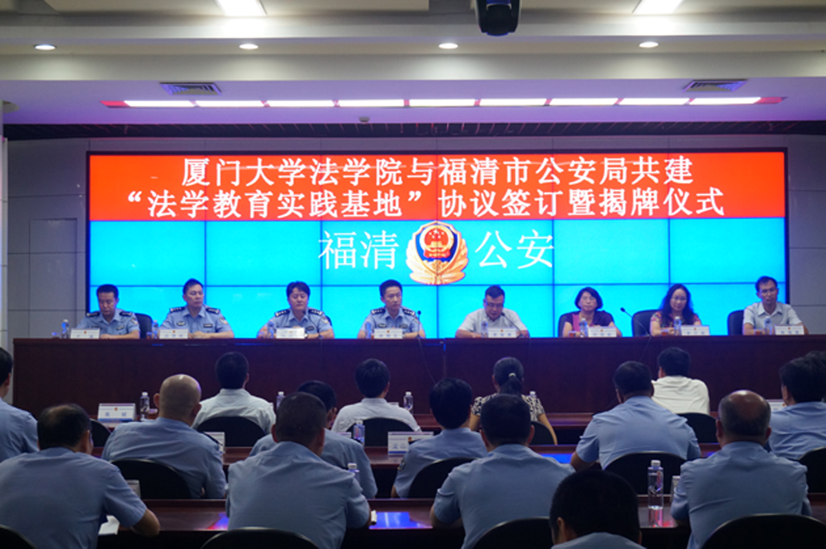 8月28日,厦门大学法学院和福清市公安局共建“法学教育实践基地”协议签订暨揭牌仪式在福清市公安局举行。我院党委书记李智勇、副院长何丽新、李兰英、副书记郭锦星,福清市公安局局长林晓东、政委陈明俤等出席了仪式。