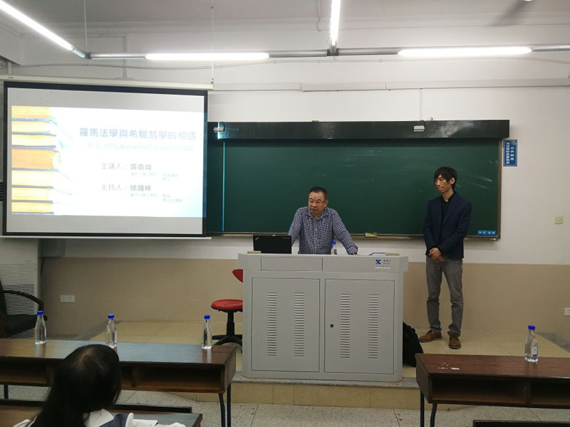 2018年11月10日晚7点半,澳门大学法学院高级讲师吴奇琦博士做客我院,讲授“罗马法学与希腊哲学的相遇:民法上的substantia与essentia理论”,讲座由徐国栋教授主持,出席讲座的还有日本北九州大学法学部教授矢泽久纯、我院毕业生、重庆大学法学院讲师谢潇博士以及来自广东的宗华律师,部分博士生、硕士生以及本科生也参加了此次讲座。