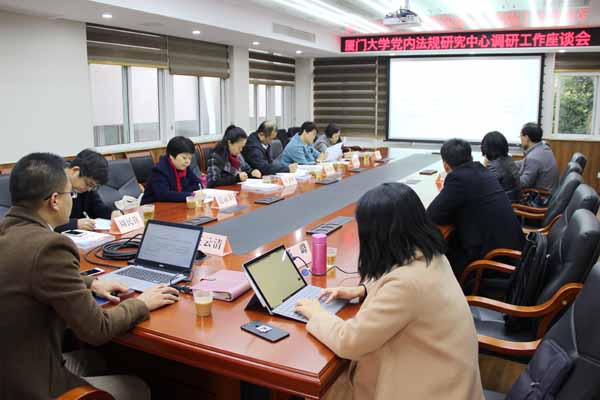 12月29日下午,厦门大学党委副书记、厦门大学党内法规中心主任林东伟一行莅临我院,召开厦门大学党内法规研究中心调研座谈会。参加座谈会的有招生办公室副主任刘艳杰、研究生院学位与学科建设办公室副主任范丽娟、社科处副处长冯文晖、财务处副处长曾瑞兰等有关职能部门领导,法学院院长宋方青教授、党委副书记郭锦星、厦门大学党内法规研究中心副主任、法学院副教授王云清、法理学教研室教师代表姜孝贤,以及厦门大学党规党纪学生研习社学生骨干。