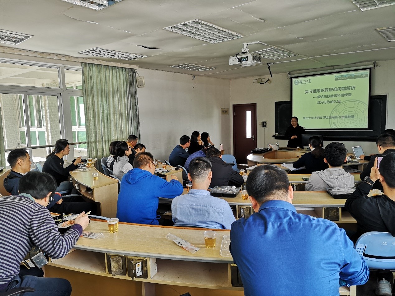 2019年12月16日,由厦门大学法学院青年教职工协会主办的信实学术午餐会(第十七期)在法学院B栋520教室顺利举行。本次午餐会由刘玉姿助理教授主持,主讲人为李兰英教授,报告主题为“关于贪污受贿罪疑难问题解析——兼论高校科研经费的贪污行为的认定”。近三十位法学院青年教职工和福建信实律师事务所的律师参加了本次学术午餐会。