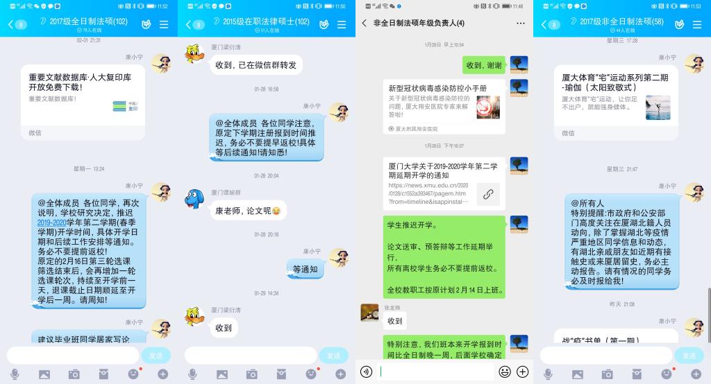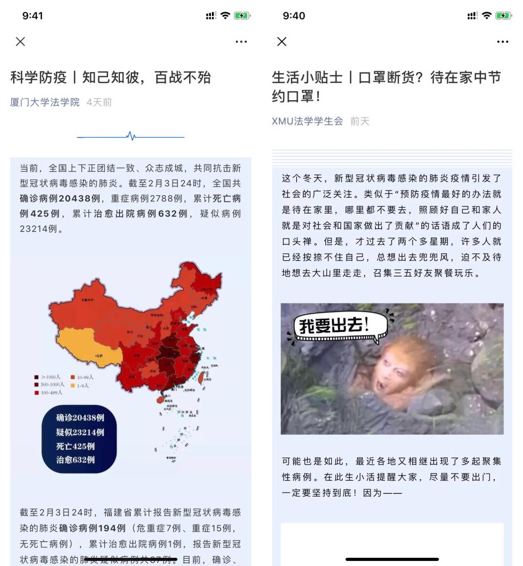 不忘初心、牢记使命。这场战“疫”是检验共产党员、共青团员守初心、担使命的试金石,疫情来袭,学院积极动员全体党员、团员投入到这场看不见硝烟的战争中,用行动对照初心,用担当书写使命,成立“厦门大学法学院留鄂师生临时党支部”、“厦门大学法学院留鄂本科生临时团支部”、“厦门大学法学院留鄂研究生临时团支部”,组织留在疫区(湖北)的39名师生争先锋、做表率,鼓励在做好自我防疫的前提下,及时通报疫情防控进展,积极宣传科学防疫知识,消除身边人员的恐慌心理,号召大家自觉成为防疫工作的“宣传小帮手”。积极利用专业知识,开展疫情产生导致的法律问题解答服务,成为身边群众的“法律小卫士”。