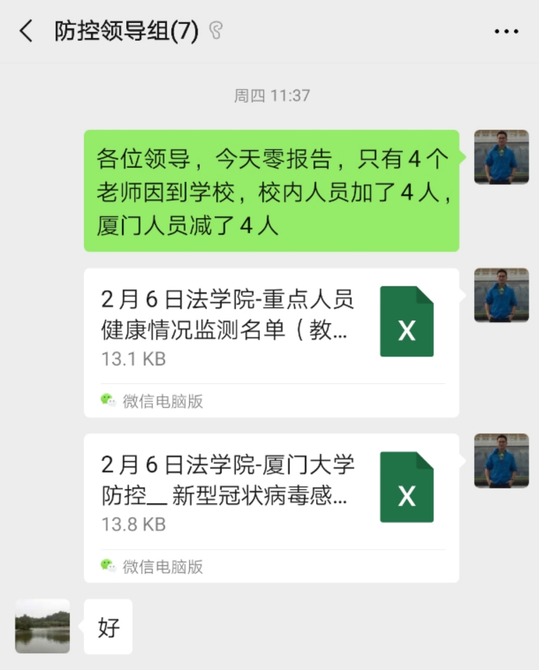 严管就是厚爱。坚决落实联防联控工作要求,学院党委进一步强化阵地意识,做到严防死守,不留死角。学院党政管理干部放弃假期休息,实行每日打卡、“日报告零报告”“人盯人”等制度,认真细致做好师生健康状况监测,全面排查教师、全日制学生、非全日制学生、国际生、交流生等各类群体,及时准确报送防疫信息。积极展开防控疫情的宣传工作,发布《致法学院全体师生的一封信》,凝聚师生抗“疫”共识,定期推送科学防“疫”宣传知识,科普抗“疫”常识。研发微信“每日打卡”功能,按时发送定制消息,实时跟踪学生动态,即使报送异常情况,实现线上与线下全覆盖、高效率摸排。