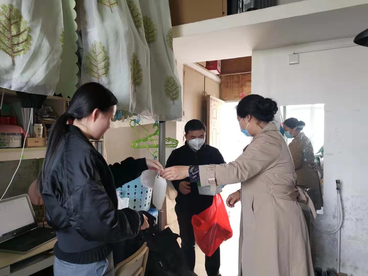 图7 党委副书记张伟、团委书记陈国渊给留校学生发放口罩、体温计