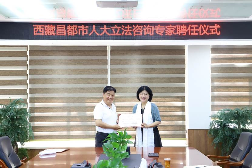 宋方青院长与王翔助理教授受聘成为西藏昌都市人大立法咨询专家,齐飞副主任为两位专家献上表达敬意的洁白的哈达并颁发聘书。
