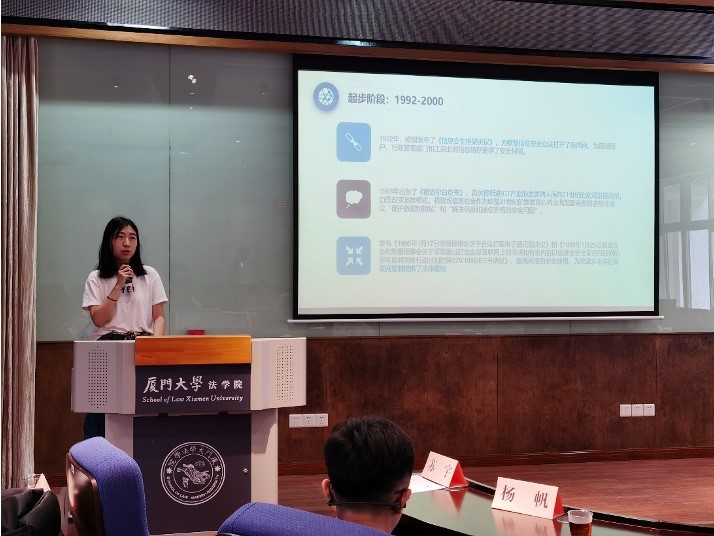 第二阶段,武汉大学博士研究生陈徽介绍了信息通信技术供应链安全领域的国际法规范及其效力实现方式、效力风险等,提出我国在应对供应链安全规范效力时可采取的策略。武汉大学博士研究生应瑶慧以“网络空间审慎义务:现状、定位与解构”为题进行发言。她从初级规则与次级规则的特殊视角厘清网络空间审慎义务的内涵,并结合联合国信息安全专家组的共识报告对该义务展开解构分析,以期展望网络空间审慎义务的研究前景。武汉大学硕士研究生梁蕾庭则以传统国际法下“有效控制”标准的形成与困境为基础,探讨网络空间中“有效控制”标准的认定,同时参照国际投资仲裁实践针对该标准的衡量因素,为网络空间国际法层面“有效控制”标准的完善提供建议。
