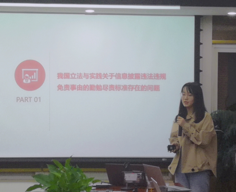 第五位展示的是陈榆同学,她展示的主题是信息披露违法违规免责事由的勤勉尽责标准。首先,她指出我国立法与实践中信息披露违法违规免责事由的勤勉尽责标准所存在的问题。在立法层面,关于信息披露违法违规各主体的责任程度区分过于笼统、不够精细,未形成具体的勤勉尽责标准。在实践中,存在对相关主体的责任适用过于严苛,且立法的缺乏和非精细化可能造成具体操作层面认定难、不统一的问题。其次,考察美国证券法信息披露违法违规免责事由之合理尽职标准,通过考察美国证券法第11条免责事由及Escott v. BarChris Construction Corp案,重点介绍了“滑动责任标准”,即根据赔偿义务人与公司和公司违法披露的信息的关联程度等区分适用“合理信赖标准”及“合理调查标准”等。最后为我国提出完善建议,认为可以适当引入这种弹性的阶梯式勤勉尽责标准,对我国信息披露违法违规行为进行更精准的监管。
