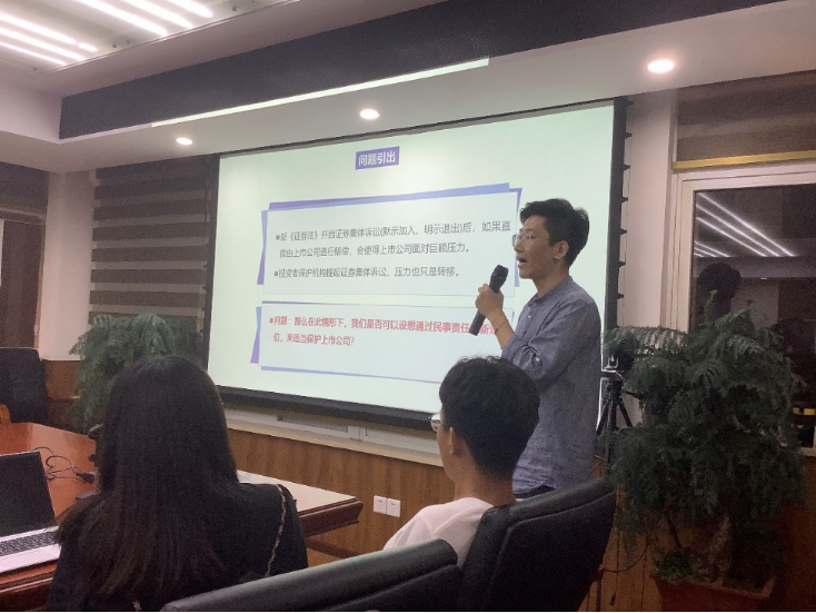 第二位展示的是刘善樊同学,他通过查找大量的司法案例,比较我国信息披露违法违规中行政处罚与民事赔偿责任的承担主体,发现虽然法律确立了多层次责任主体制度,但在司法实践中实际承担民事责任的主体基本上只有上市公司,呈现出民事责任的承担主体单一化的现状,这将直接影响虚假陈述民事赔偿制度对于震慑违法者和保护投资者两大价值目标的实现。他认为,保荐机构先行赔付制度可以避免控股股东、实际控制人、董监高逃脱民事赔偿责任,经过完善后的保荐机构先行赔付制度有利于解决司法实践中承担民事责任主体单一化的困境。