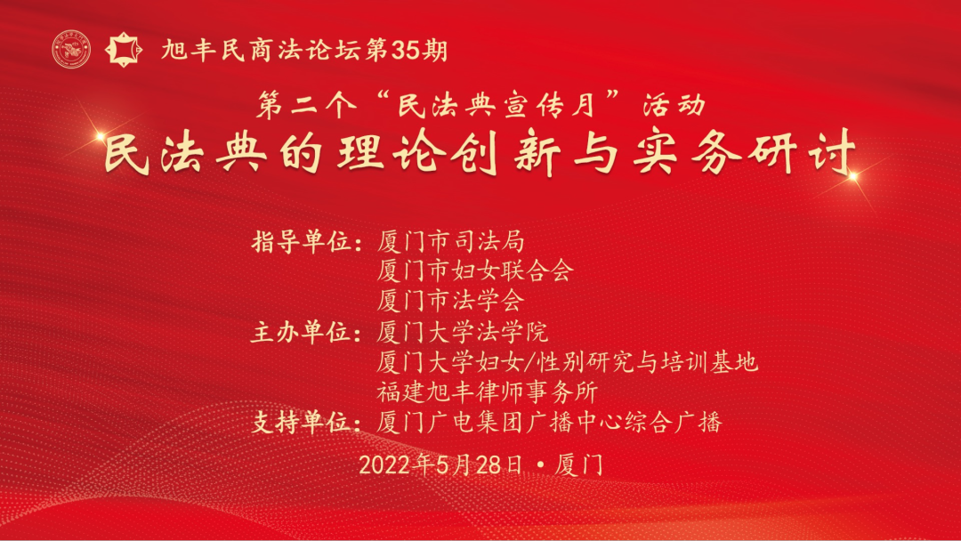 正值《中华人民共和国民法典》颁行两周年之际,为响应中宣部、司法部等部门关于组织开展第二个“民法典宣传月”活动的号召,2022年5月28日,厦门大学法学院、厦门大学妇女/性别研究与培训基地联合福建旭丰律师事务所共同举办了“民法典的理论创新与实务研讨”会议。厦门大学党委常务副书记林东伟,厦门市司法局党组书记、局长丁贤志,厦门市司法局党组成员、副局长李明哲,厦门市法学会党组成员、副会长李包明,厦门市妇女联合会权益部部长胡艺芬,厦门大学法学院副院长、教授郑晓剑等领导出席本次论坛,厦门大学法学院民商法学科老师和研究生以及厦门法律界的诸多专业人士现场参会。本次活动得到了厦门市司法局、厦门市妇女联合会、厦门市法学会的指导,厦门广电集团广播中心综合广播、海丝中央法务区云平台支持传播。会议在厦门翔业大厦11楼旭丰所会议中心举行。