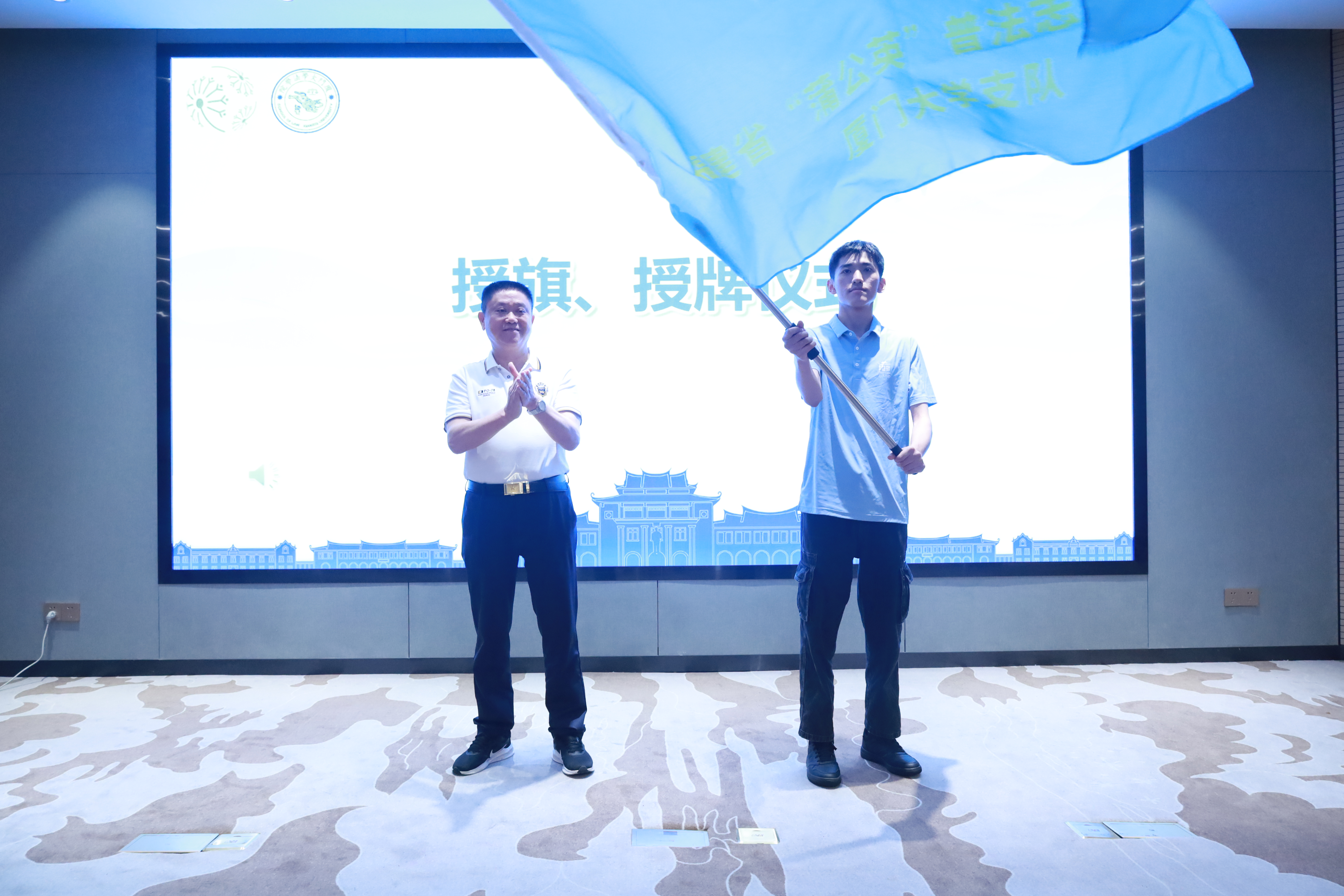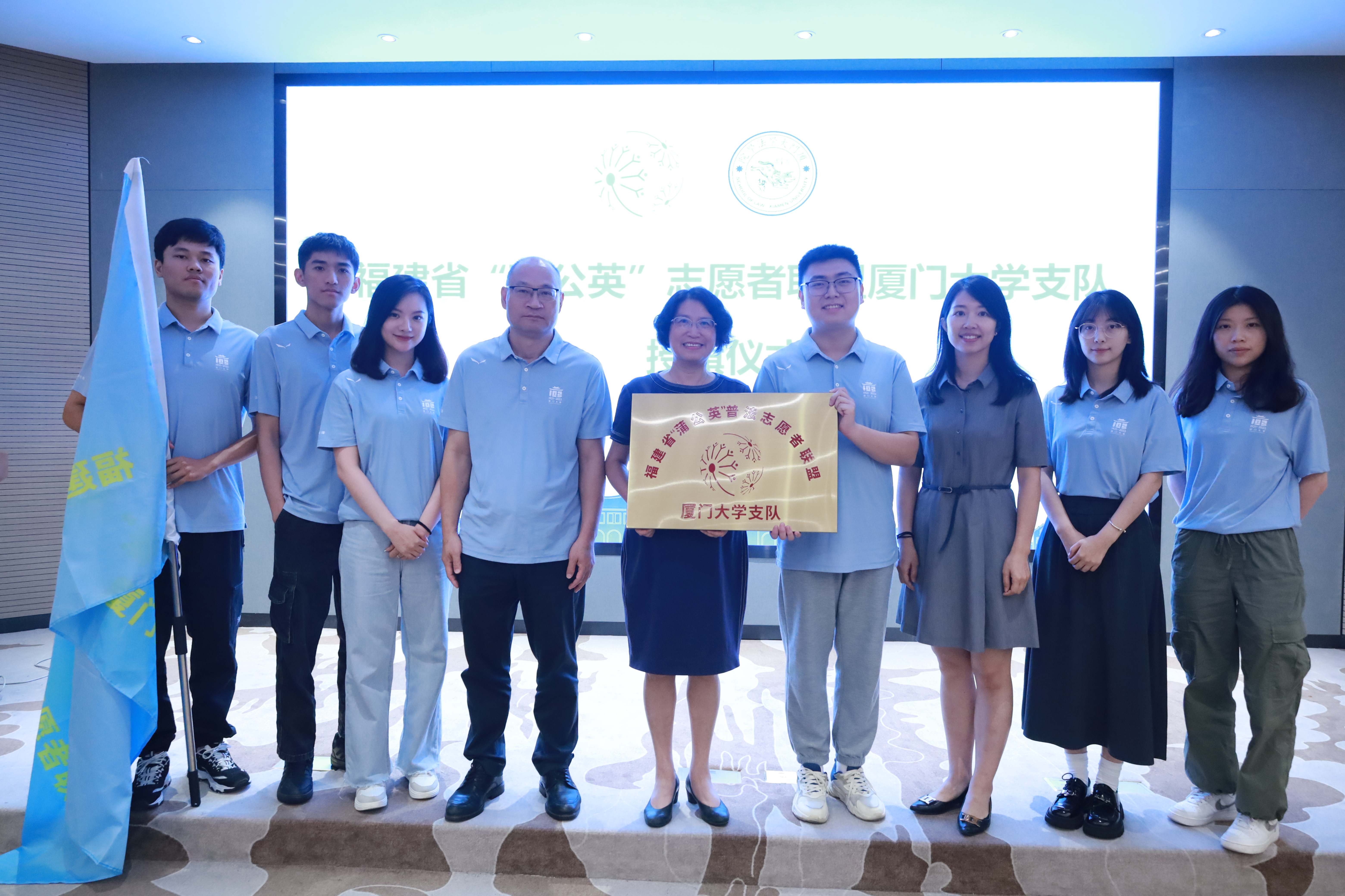 仪式上,林德明、林晓霞分别向“蒲公英”普法志愿者联盟厦门大学支队授旗、授牌。