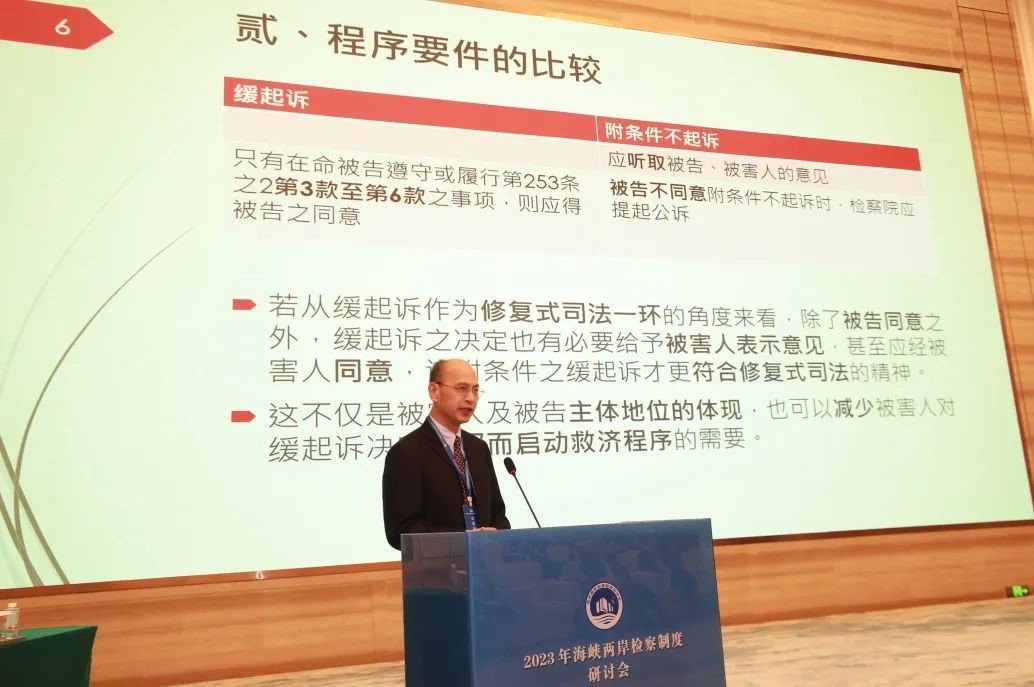 李锡栋理事以《缓起诉与附条件不起诉制度的比较——以处分前为中心》为题,从台湾地区的缓起诉与德国的中止诉讼处分和日本的起诉犹豫着手,厘定缓起诉的制度内涵。紧接着从适用范围、程序要件、附加负担等三个方面,对台湾地区的缓起诉和大陆的附条件不起诉进行了系统而全面的对比。