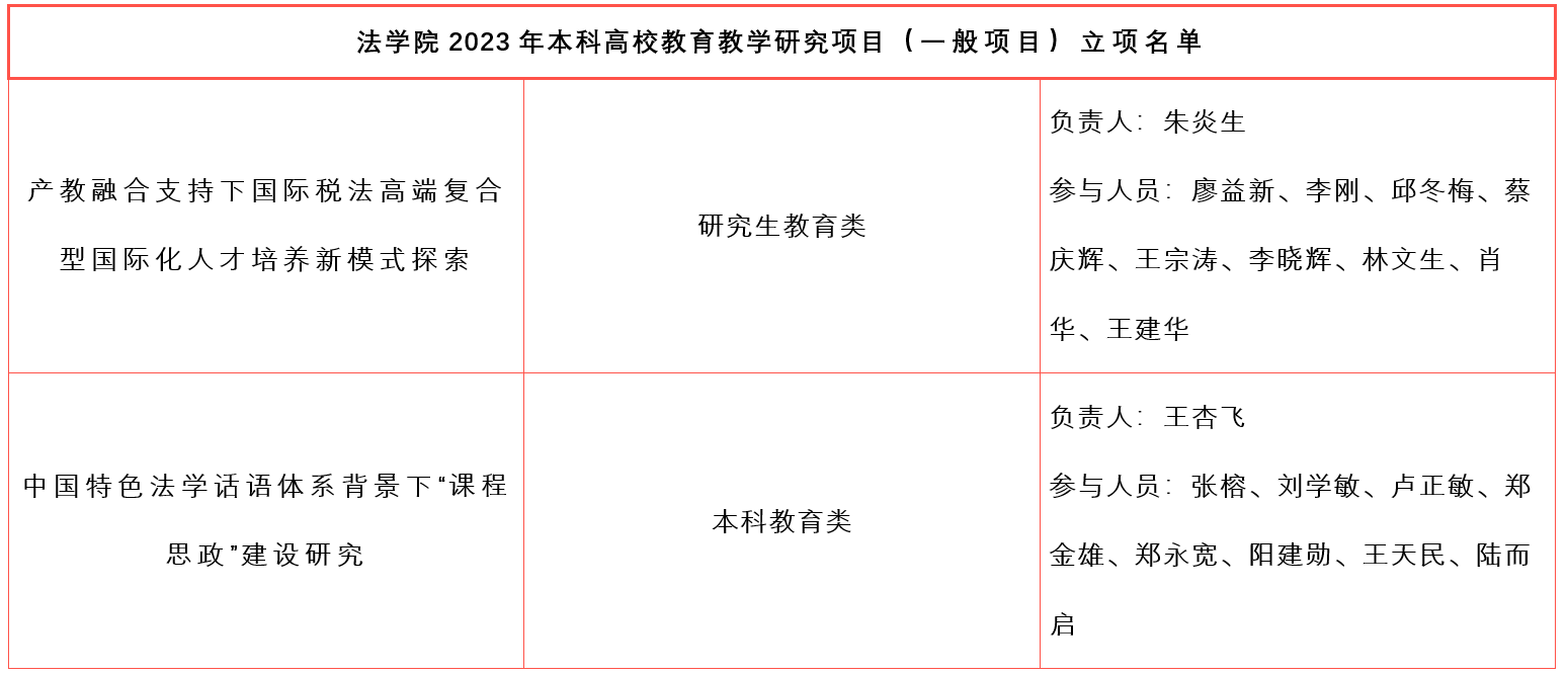 近日,福建省教育厅公布了2023年本科高校教育教学研究项目立项名单(闽教高[2023]20号)。法学院朱炎生教授负责的《产教融合支持下国际税法高端复合型国际化人才培养新模式探索》和王杏飞教授负责的《中国特色法学话语体系背景下“课程思政”建设研究》获2023年本科高校教育教学研究项目(一般项目)立项。