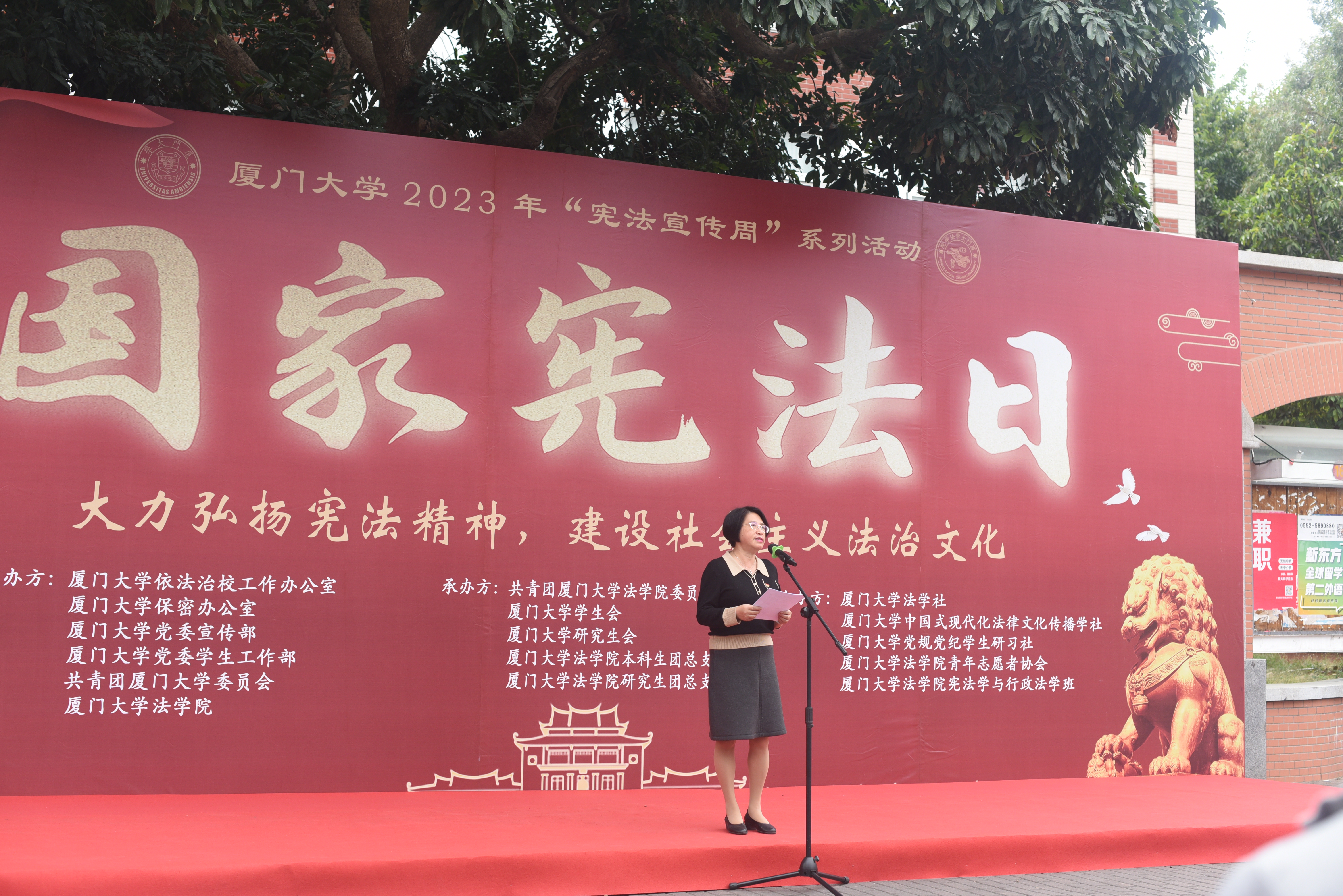 为深入学习贯彻党的二十大精神,贯彻落实习近平法治思想和习近平总书记关于宪法法治教育的重要指示精神,大力弘扬宪法精神,建设社会主义法治文化,在第十个国家宪法日即将到来之际,12月3日上午,厦门大学2023年国家宪法日主题宣传教育活动在思明校区三家村学生活动广场举行。厦门大学党委常务副书记林东伟,厦门市委机要保密局二级巡视员宋惠平,校纪委副书记、依法治校工作办公室主任刘宁,校党建办主任、党委组织部副部长葛郝锐,校团委书记洪海松,法学院院长宋方青,校办公室副主任兼保密办公室副主任袁国柱,校党委宣传部副部长杨机像,校党委学生工作部副部长刘俊英出席本次活动。活动由法学院党委书记何丽新教授主持。
