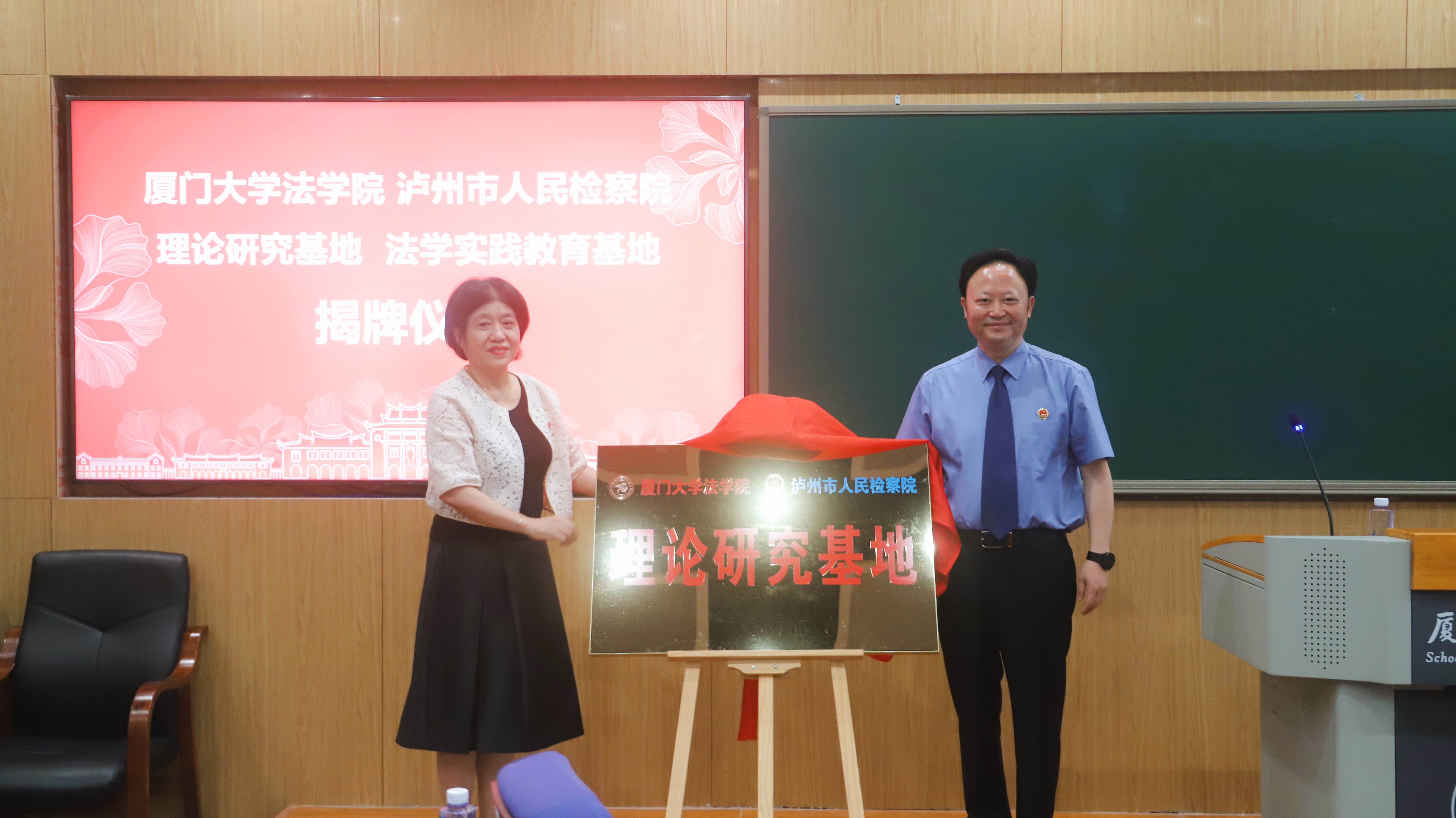 揭牌仪式上,泸州市人民检察院党组书记、检察长刘孝勇,厦门大学法学院院长宋方青共同为两院共建“理论研究基地”与“法学实践教育基地”揭牌。