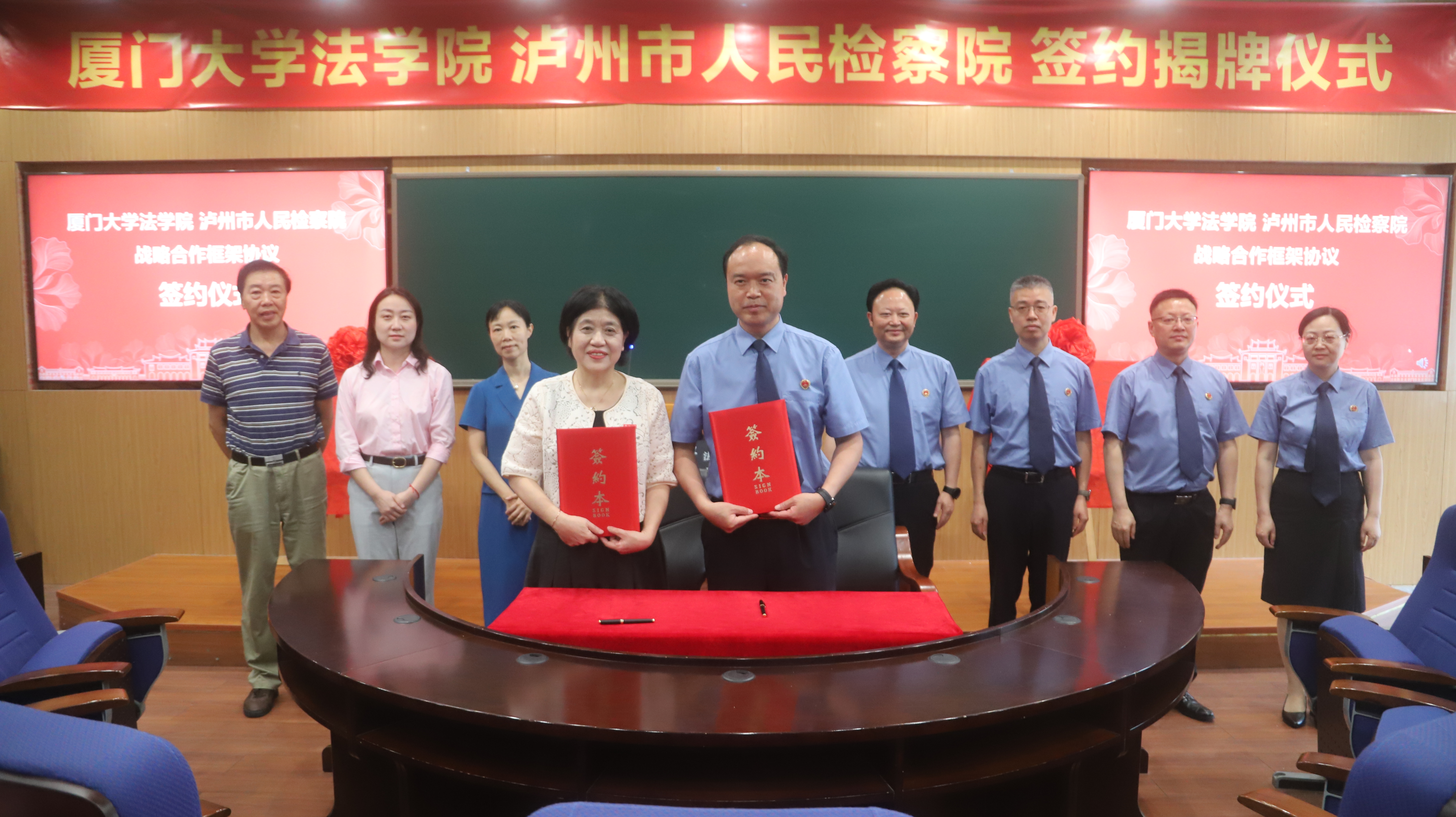 签约仪式上,泸州市人民检察院党组副书记、常务副检察长胡运汉,厦门大学法学院院长宋方青代表双方签署合作协议,双方领导共同见证。