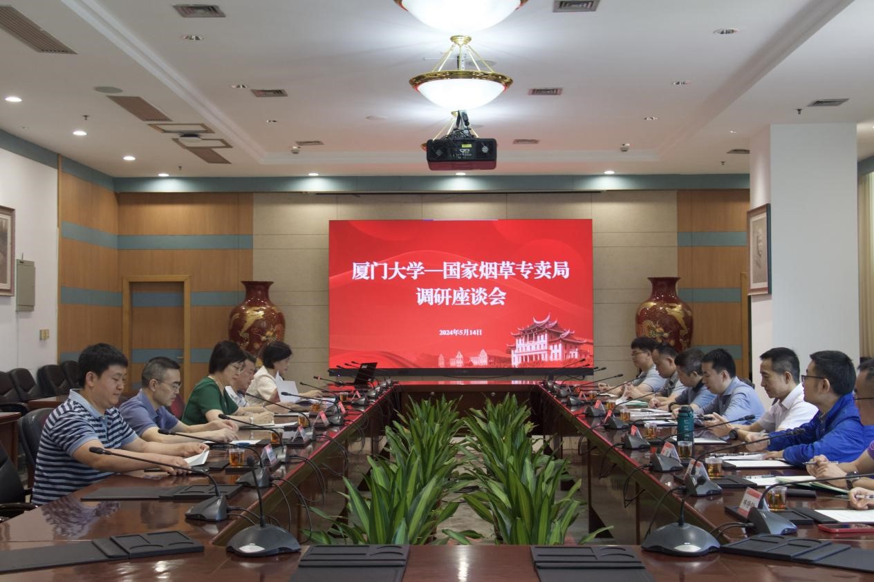 2024年5月14日上午,厦门大学与国家烟草专卖局调研座谈会在厦门大学颂恩楼215会议室成功举行。国家烟草专卖局专卖司互联网涉烟监管处处长孙冀、副处长钟昊,福建中烟工业有限责任公司党组成员、副总经理吴志文,福建省烟草专卖局专卖处(稽查总队)副总队长欧阳建筑等参加座谈,厦门大学党委常委、副校长邓朝晖出席座谈会并致辞,厦门大学国内合作办公室主任林奋强、厦门大学继续教育管理处处长孙梓光、法学院院长宋方青、烟草法律与经济政策研究中心主任姜孝贤以及部分师生代表参加座谈。