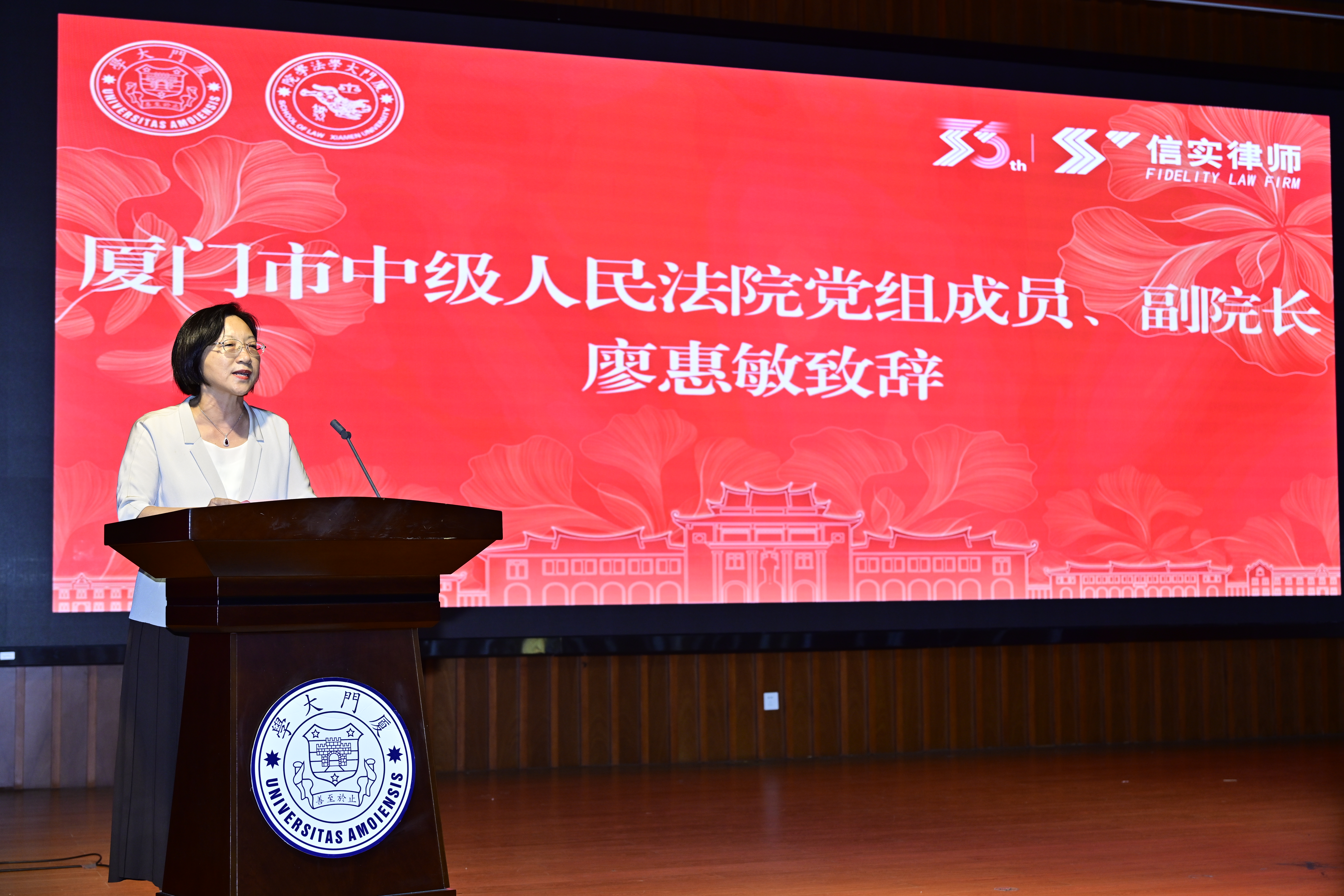 厦门市中级人民法院党组成员、副院长廖惠敏向大赛的顺利举办表示祝贺。她介绍了厦门市中级人民法院与厦门大学共建“法学教育实践基地”以来,在党建、实践教学、司法培训等方面开展的交流合作,寄语广大法学学子坚定理想信念、锤炼知识本领、提升实践能力。未来,厦门市中级人民法院将不断创新与高校合作共赢新机制,进一步搭建培养法学生实践能力的平台,促进法学高层次人才培养和法治工作队伍建设,深化全方位合作交流,共同书写新时代法治人才培养的使命与担当。