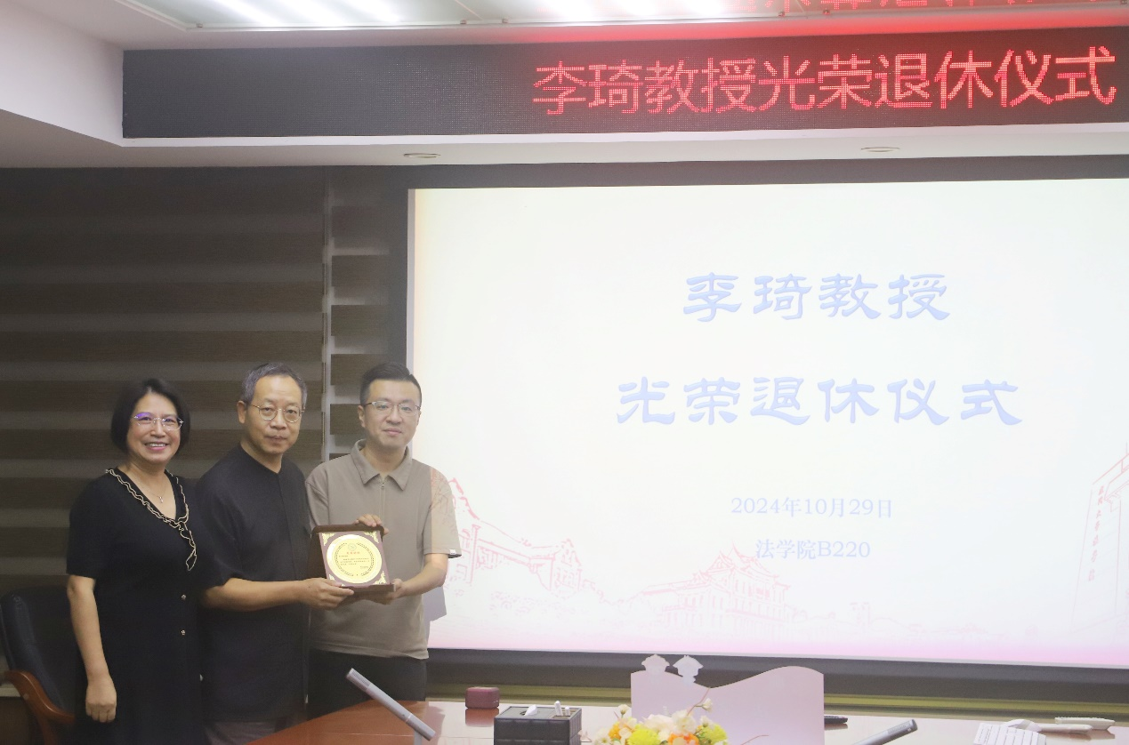 10月29日下午,李琦教授荣休仪式在法学院220会议室举行。法学院党委书记何丽新、院长陈鹏、党委副书记吴荻、副院长王杏飞以及刘连泰教授、施余兵教授、孙丽岩教授等教师代表参加会议。