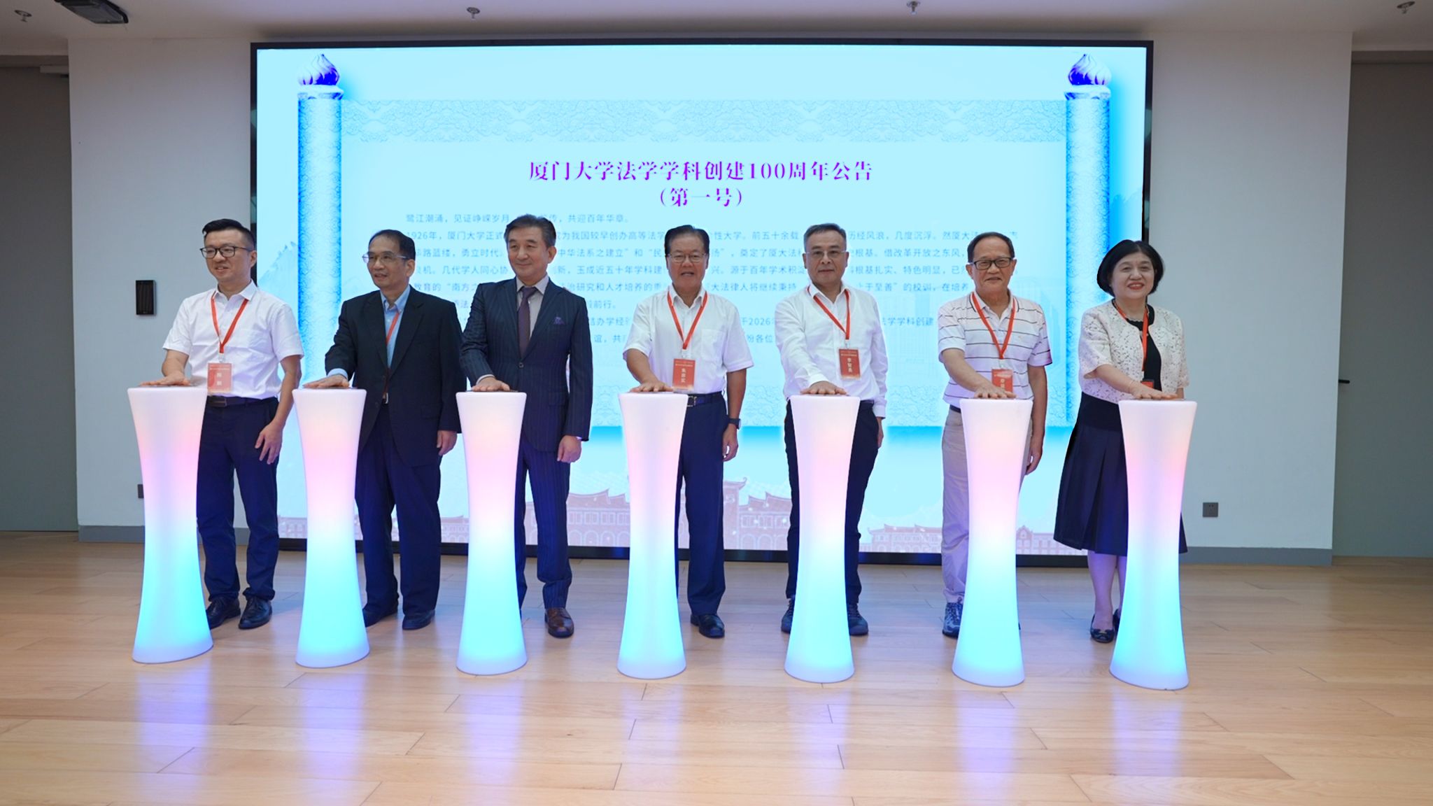 厦门大学法学学科创建100周年公告(第一号)发布。朱崇实、李智勇、黄毅、廖益新、徐崇利、宋方青、陈鹏共同点亮灯柱,与在场嘉宾一同见证这一重要时刻。