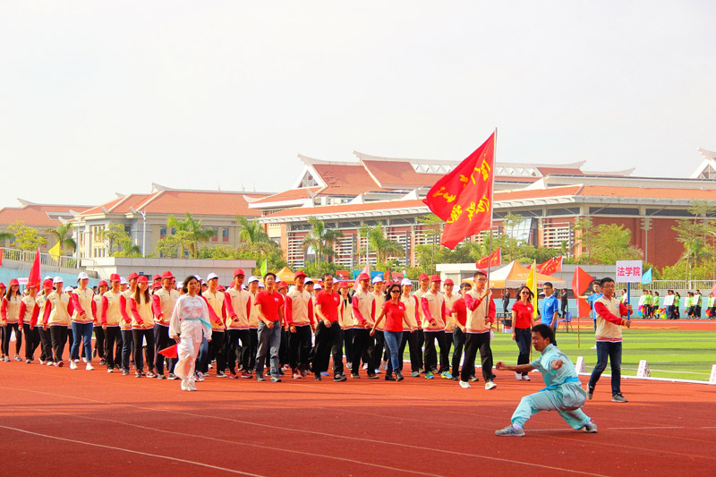 法学院代表队在学院党委副书记周蕾、党委副书记郭锦星、团委书记高斌、团委副书记林旭荣、研究生辅导员宋磊华、本科生辅导员杨璐带领下入场。队列前方,由2015级本科生易乐也同学和2016级本科生张鑫同学打头阵,他们精彩的武术表演引得场上喝彩连连。后方的同学们头戴小白帽,迈着整齐划一的步伐,昂首阔步,精神抖擞,意气风发地走来。队伍行至主席台中央,伴随着清脆的口令,同学们换上小红帽,摆出了“90”的图案,为法学院90周年庆献上诚挚的祝福。铿锵的口号,坚定的步伐,彰显出法学学子挑战自我,勇于拼搏的精神气魄。相信运动场上的法学学子定能奋勇争先,赛出水平,为法学院争光添彩。
