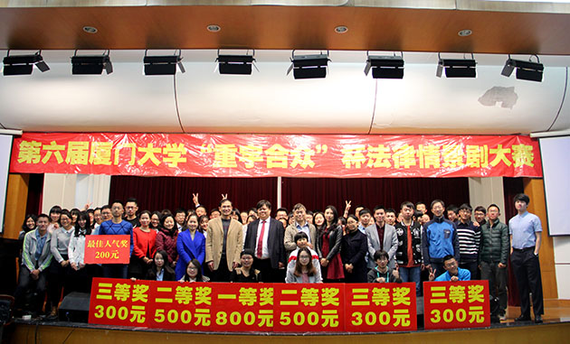 2016年3月28日19点30分,由厦门大学教务处、共青团厦门大学委员会、厦门大学法学院主办、厦门大学大学生法律援助中心暨法学院青协承办的第六届厦门大学“重宇合众”杯法律情景剧决赛在法学院模拟法庭正式上演。本次决赛邀请到了法学院党委副书记郭锦星、法学院吴旭莉老师、陆而启老师、汪东升老师、刘梦秘书等多位学院领导、老师以及重宇合众律师事务所首席合伙人、名誉主任涂崇禹律师和滨海司法所司法助理员刘洋担任评委。另外,还有多名来自重宇合众律所的律师和滨海司法所、厦港司法所的嘉宾受邀出席观看比赛。