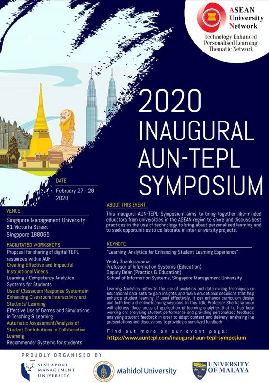东盟大学联盟首届 “科技辅助个性化学习”研讨会即将于2020年2月27日至28日在新加坡管理大学举办,承办单位还包括泰国玛希隆大学和马来西亚马来亚大学。