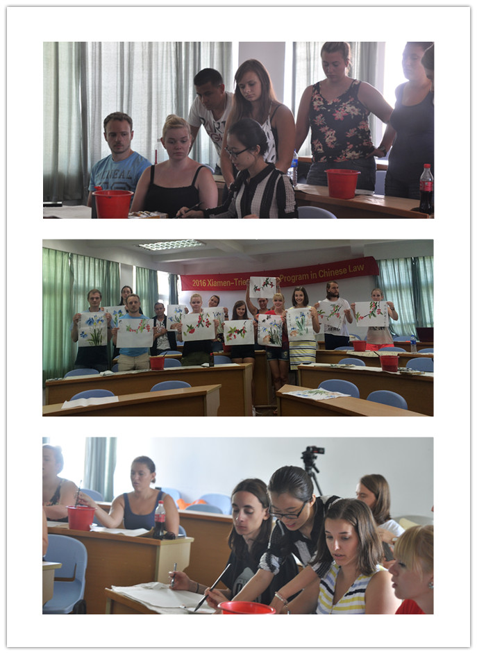 课堂一开始,程老师先就国画进行了一个大致的介绍,并且向大家展示了几幅经典的国画作品,从中可窥探出中华千年文化的博大精深,德国学生也对此表现出了深厚的兴趣。紧接着,程老师为大家准备了纸笔,让大家亲身体验“作画”的感受。在程老师示范过后,大家纷纷开始了自己的创作,作为刚刚接触国画的人,德国学生在此表现了不错的天赋,所有的作品都有很高的完成度。除此以外,程老师还教大家中文写了落款,中国的繁体字文化也给德国学生留下了深刻的印象。